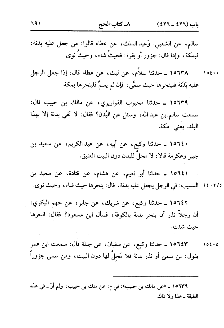 15639- حَدَّثَنَا مَحبُوبٌ الْقَوَارِيرِيُّ , عَنْ مَالِكِ بْنِ حَبِيبٍ ، قَالَ : سَمِعْتُ سَالِمَ بْنَ عَبْدِ اللهِ وَسُئِلَ عَنِ الْبُدْنِ ، فَقَالَ : لاَ تفي بَدَنَةٌ إِلاَّ بِهَذَا الْبَلَدِ ، يَعْنِي مَكَّةَ.