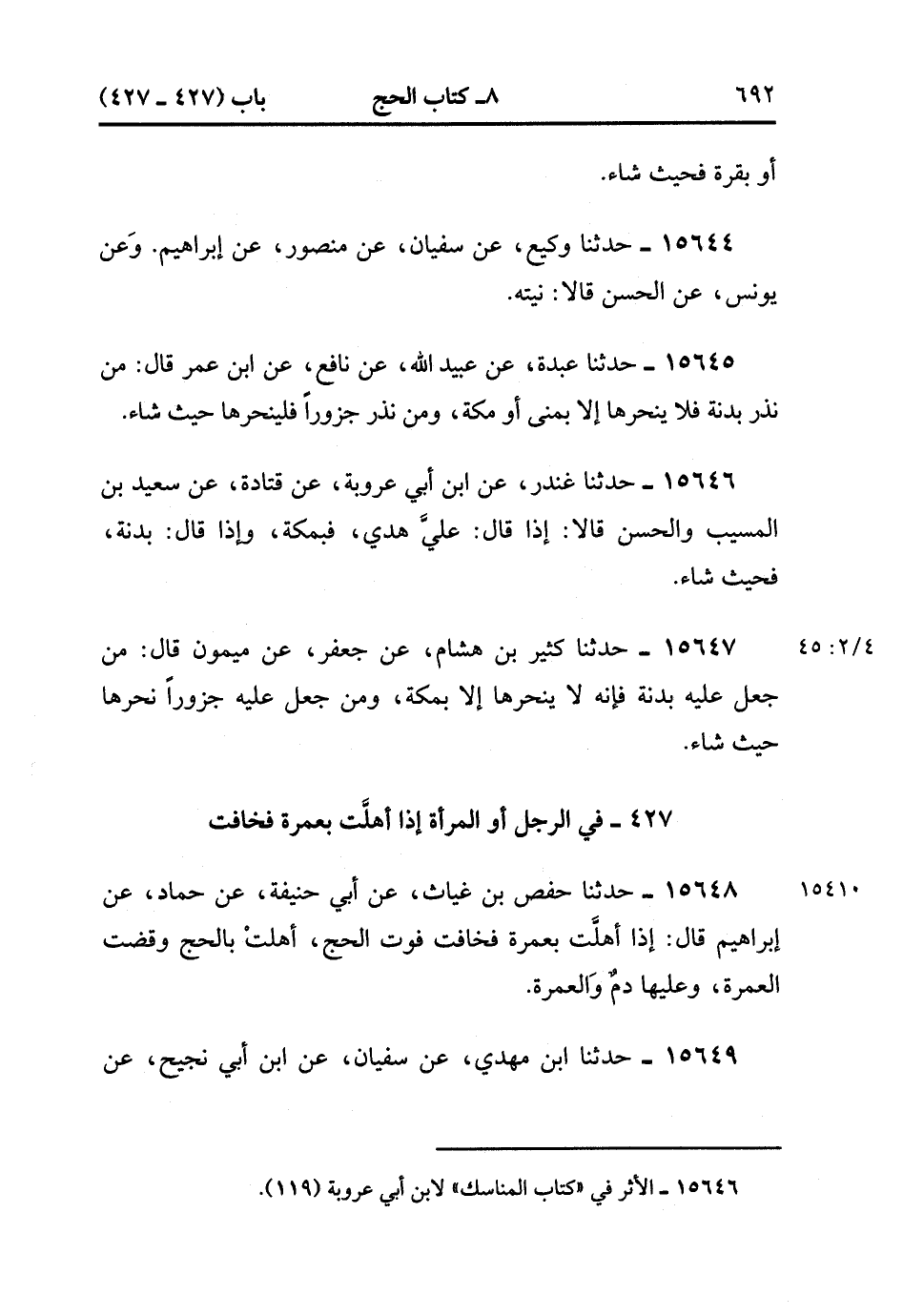 15649- حَدَّثَنَا ابْنُ مَهْدِيٍّ , عَنْ سُفْيَانَ , عَنِ ابْنِ أَبِي نَجِيحٍ , عَنْ مُجَاهِدٍ ، وَعَطَاءٍ ، قَالَ : سَأَلْتُهُمَا , عَنِ امْرَأَةٍ قَدِمَتْ مَكَّةَ مُعْتَمِرَةً ، فَحَاضَتْ فَخَشِيَتْ أَنْ يَفُوتَهَا الْحَجُّ ، فَقَالاَ : تُهِلُّ بِالْحَجِّ وَتَقْضِي. (4/45:2).