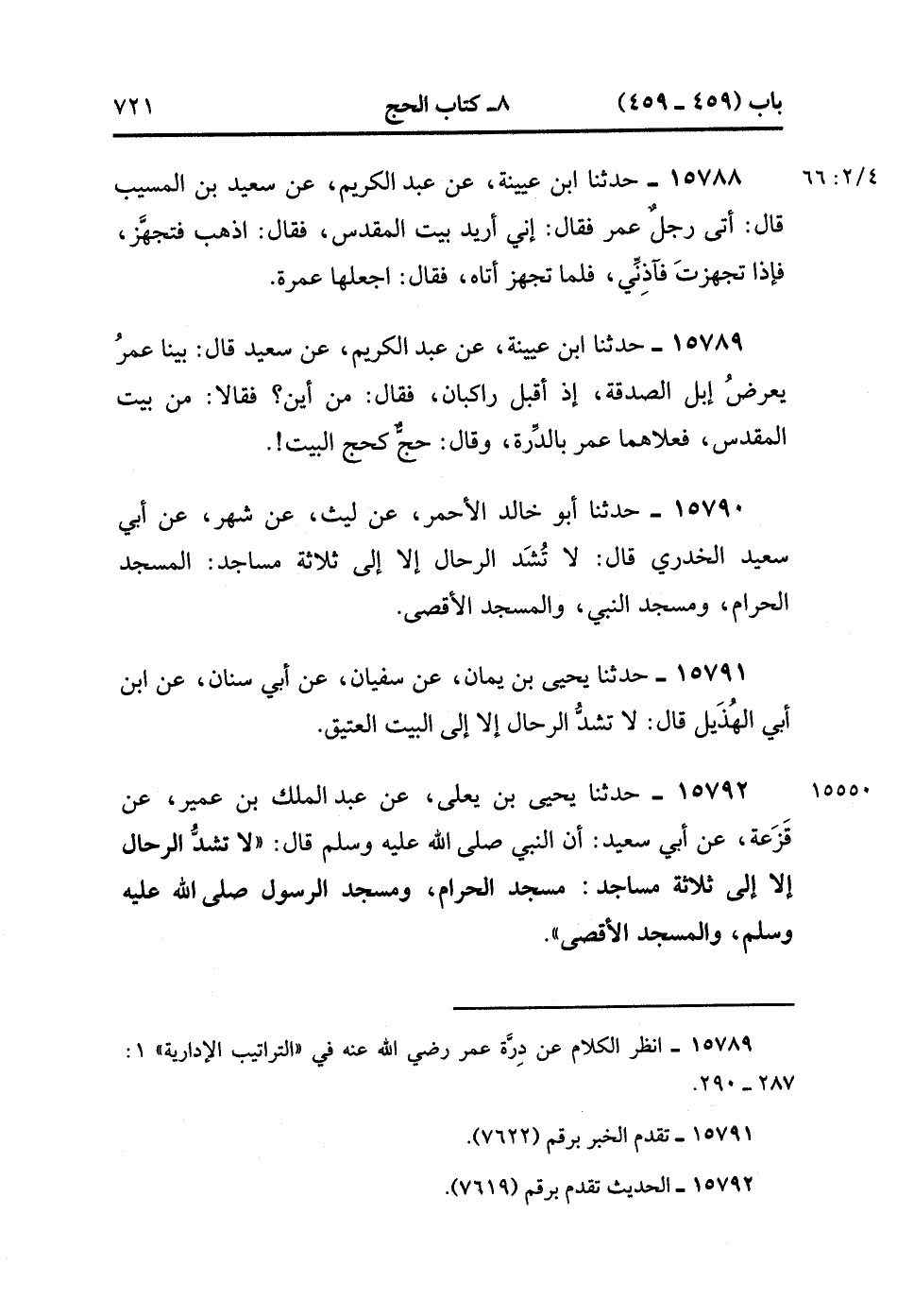 15792- حَدَّثَنَا يَحْيَى بْنُ يَعْلَى , عَنْ عَبْدِ الْمَلِكِ بْنِ عُمَيْرٍ , عَنْ قَزَعَةَ , عَنْ أَبِي سَعِيدٍ ، أَنَّ النَّبِيَّ صَلَّى الله عَلَيْهِ وَسَلَّمَ ، قَالَ : لاَ تُشَدُّ الرِّحَالُ إِلاَّ إلَى ثَلاَثَةِ مَسَاجِدَ : مَسْجِدِ الْحَرَامِ وَمَسْجِدِ الرَّسُولِ صَلَّى الله عَلَيْهِ وَسَلَّمَ وَالمَسْجِدِ الأَقْصَى. (4/66:2).