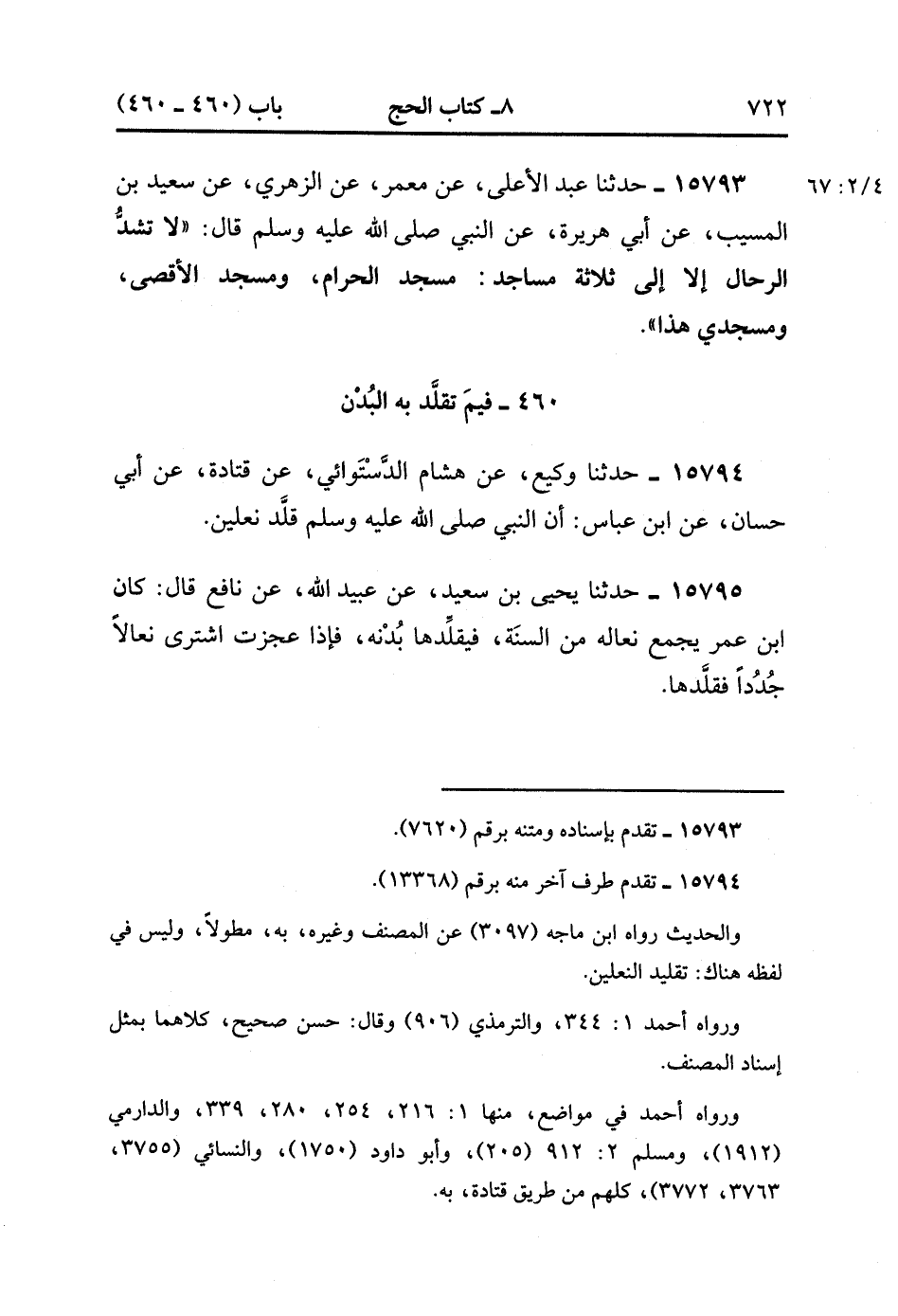 15795- حَدَّثَنَا يَحْيَى بْنُ سَعِيدٍ , عَنْ عُبَيْدِ اللهِ , عَنْ نَافِعٍ ، قَالَ : كَانَ ابْنُ عُمَرَ يَجْمَعُ نَعْلَهُ مِنَ السَّنَةِ فَيُقَلِّدُهَا بُدْنَهُ ، فَإِذَا عَجَزَتِ اشْتَرَى نِعَالاً جُدُدًا فَقَلَّدَهَا. (4/67:2).