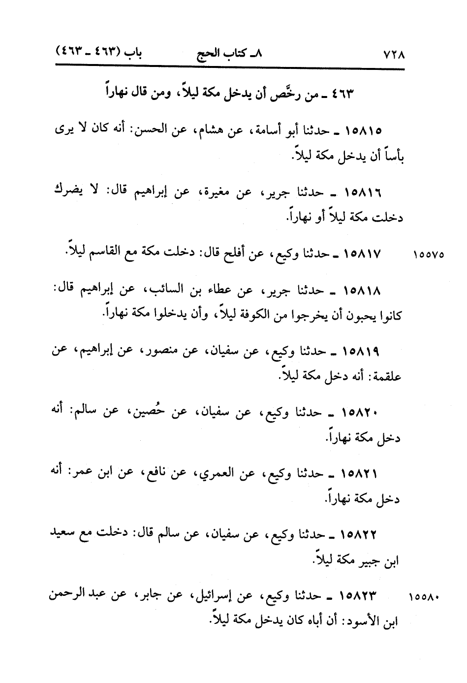 15822- حَدَّثَنَا وَكِيعٌ , عَنْ سُفْيَانَ , عَنْ سَالِمٍ ، قَالَ : دَخَلْت مَعَ سَعِيدِ بْنِ جُبَيْرٍ مَكَّةَ لَيْلاً. (4/70:2)