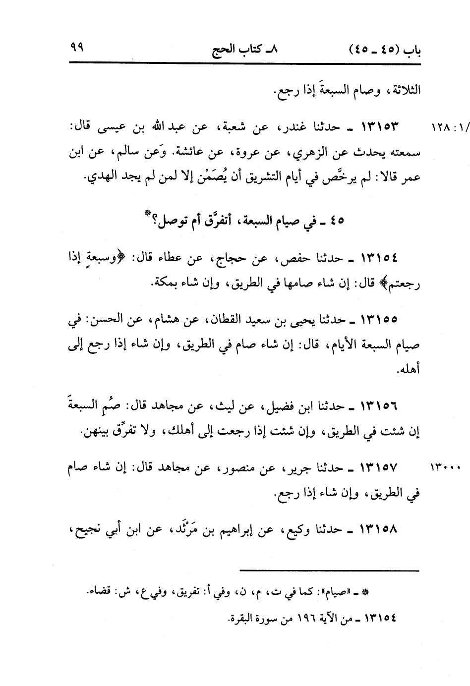 13154- حدَّثَنَا حَفْصٌ ، عَنْ حَجَّاجٍ ، عَنْ عَطَاءٍ ، قَالَ : {وَسَبْعَةٍ إذَا رَجَعْتُمْ} قَالَ : إِنْ شَاءَ صَامَهَا فِي الطَّرِيقِ ، وَإِنْ شَاءَ بِمَكَّةَ.