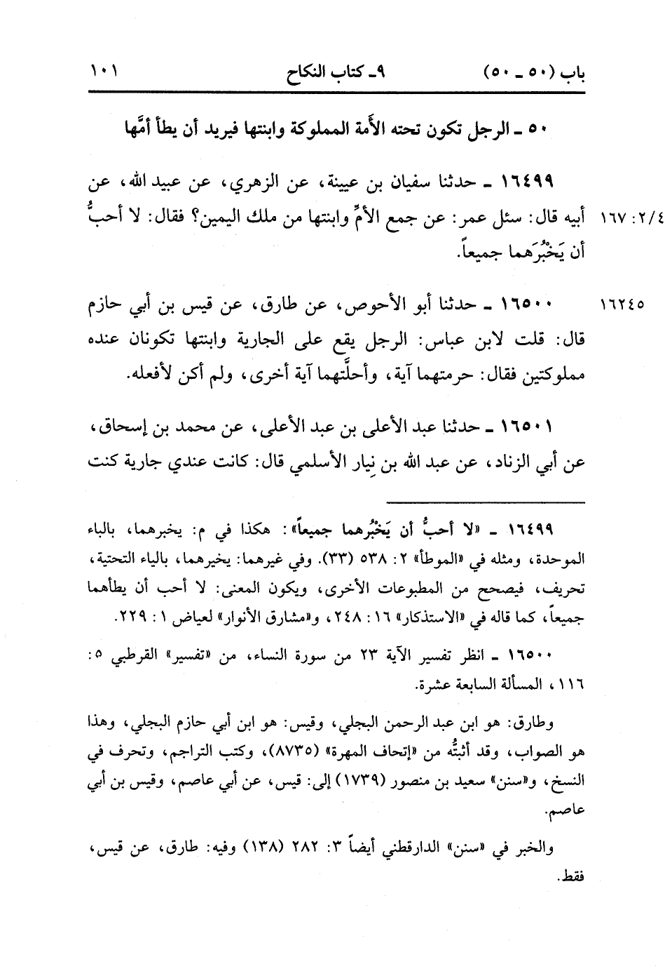 16501- حَدَّثَنَا عَبْدُ الأَعْلَى بْنُ عَبْدِ الأَعْلَى , عَنْ مُحَمَّدِ بْنِ إِسْحَاقَ , عَنْ أَبِي الزِّنَادِ , عَنْ عَبْدِ اللهِ بْنِ نِيَار الأَسْلَمِيِّ قَالَ : كَانَتْ عِنْدِي جَارِيَةٌ كُنْت أتَّطِئُهَا وَكَانَتْ مَعَهَا ابْنَةٌ لَهَا فَأَدْرَكَتِ ابْنَتُهَا فَأَرَدْت أَنْ أمسك عَنْهَا وأتطي ابْنَتَهَا فَقَلتُ : لاَ أَفْعَلُ ذَلِكَ حَتَّى أَسْأَلَ عُثْمَانَ بْنَ عَفَّانَ ، فَسَأَلَتْهُ عَنْ ذَلِكَ , فَقَالَ : أَمَّا أَنَا فَلَمْ أَكُنْ لنطلع مِنْهُما مُطَّلَعًا وَاحِدًا. (4/167:2).