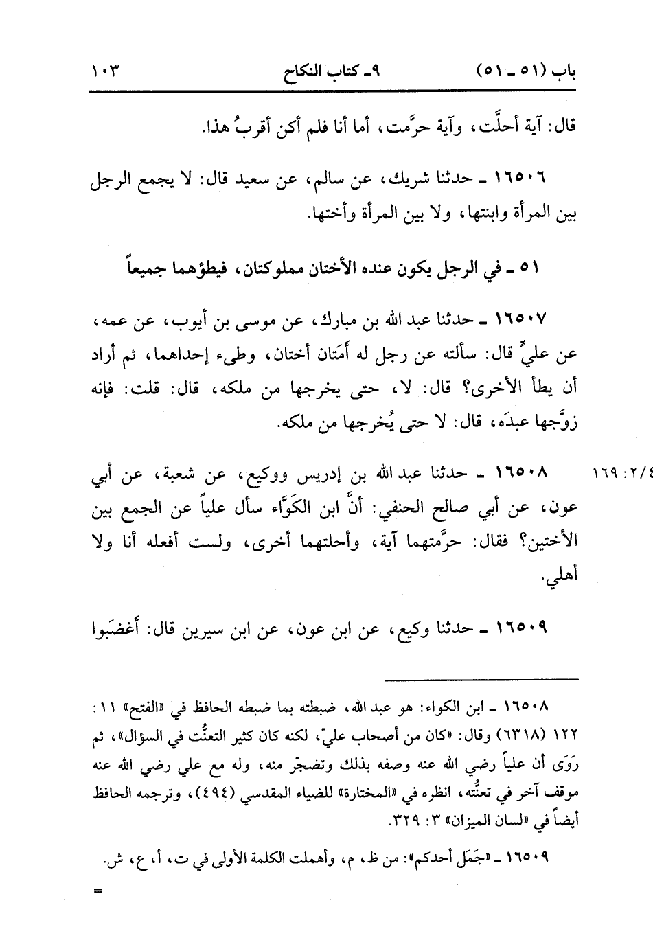 16508- حَدَّثَنَا عَبْدُ اللهِ بْنِ إدْرِيسَ , وَكِيعٌ , عَنْ شُعْبَةَ , عَنْ أَبِي عَوْنٍ , عَنْ أَبِي صَالِحٍ الْحَنَفِيِّ أَنَّ ابْنَ الْكَوَّاءِ سَأَلَ عَلِيًّا , عَنِ الْجَمْعِ بَيْنَ الأُخْتَيْنِ , فَقَالَ : حرَّمَتْهُمَا آيَةٌ وَأَحَلَّتْهُمَا أُخْرَى وَلَسْت أَفْعَلُ أَنَا وَلاَ أَهْلِي.