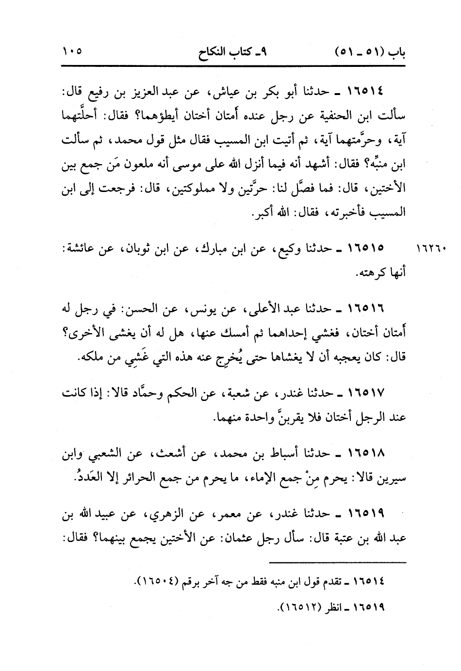 16519- حَدَّثَنَا غُنْدَرٌ , عَنْ مَعْمَرٍ , عَنِ الزُّهْرِيِّ , عَنْ عُبَيْدِ اللهِ بْنِ عَبْدِ اللهِ بْنِ عُتْبَةَ قَالَ : سَأَلَ رَجُلٌ عُثْمَانَ , عَنِ الأُخْتَيْنِ يَجْمَعُ بَيْنَهُمَا ، فَقَالَ : أَحَلَّتْهُمَا آيَةٌ وَحَرَّمَتْهُمَا آيَةٌ وَلاَ آمُرُك وَلاَ أَنْهَاك فَلَقِيَ عَلِيًّا بِالْبَابِ , فَقَالَ : عَمَّ سَأَلْتَهُ ؟ فَأَخْبَرَهُ , فَقَالَ : لَكِنِّي أَنْهَاك وَلَوْ كَانَ لِي عَلَيْك سَبِيلٌ ثُمَّ فَعَلْت ذَلِكَ لأَوْجَعْتُك. (4/170:2).