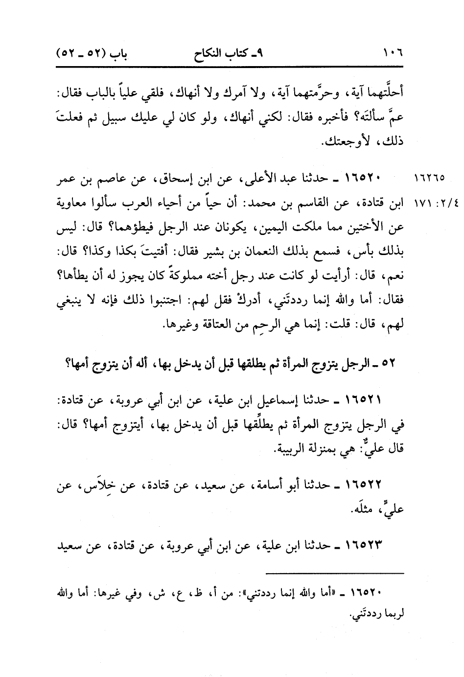 16521- حدَّثَنَا إِسْمَاعِيلُ ابْنُ عُلَيَّةَ , عَنِ ابْنِ أَبِي عَرُوبَةَ , عَنْ قَتَادَةَ فِي الرَّجُلِ يَتَزَوَّجُ الْمَرْأَةَ ثُمَّ يُطَلِّقُهَا قَبْلَ أَنْ يَدْخُلَ بِهَا ، أَيَتَزَوَّجُ أُمَّهَا ؟ قَالَ : قَالَ عَلِيٌّ : هِيَ بِمَنْزِلَةِ الرَّبِيبَةِ.