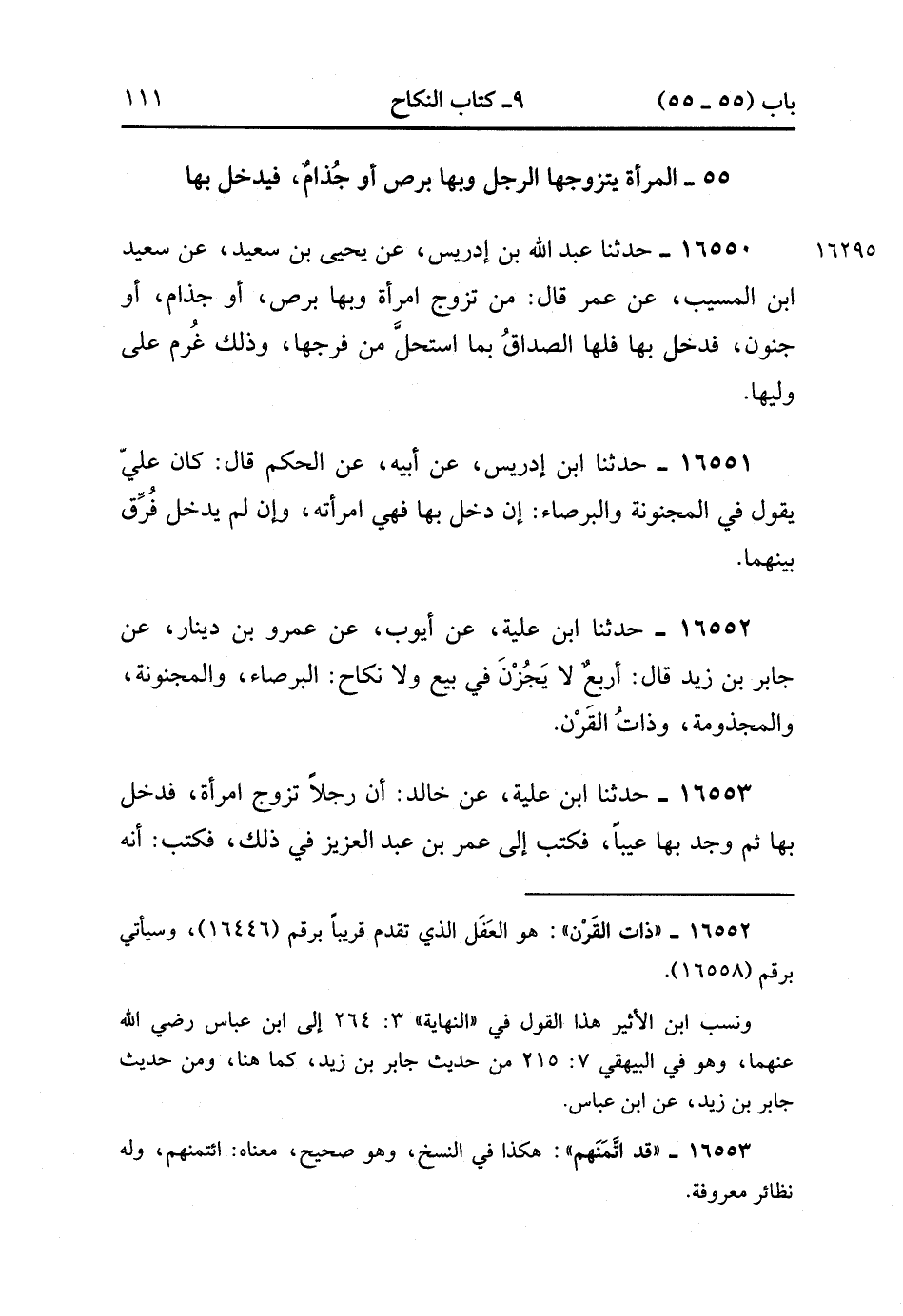 16552- حَدَّثَنَا ابْنُ عُلَيَّةَ , عَنْ أَيُّوبَ , عَنْ عَمْرِو بْنِ دِينَارٍ , عَنْ جَابِرِ بْنِ زَيْدٍ قَالَ : أَرْبَعٌ لاَ يَجُوزُنَ فِي بَيْعٍ وَلاَ نِكَاحٍ : الْبَرْصَاءُ وَالْمَجْنُونَةُ وَالْمَجْذُومَةُ وَذَاتُ الْقَرَنِ.