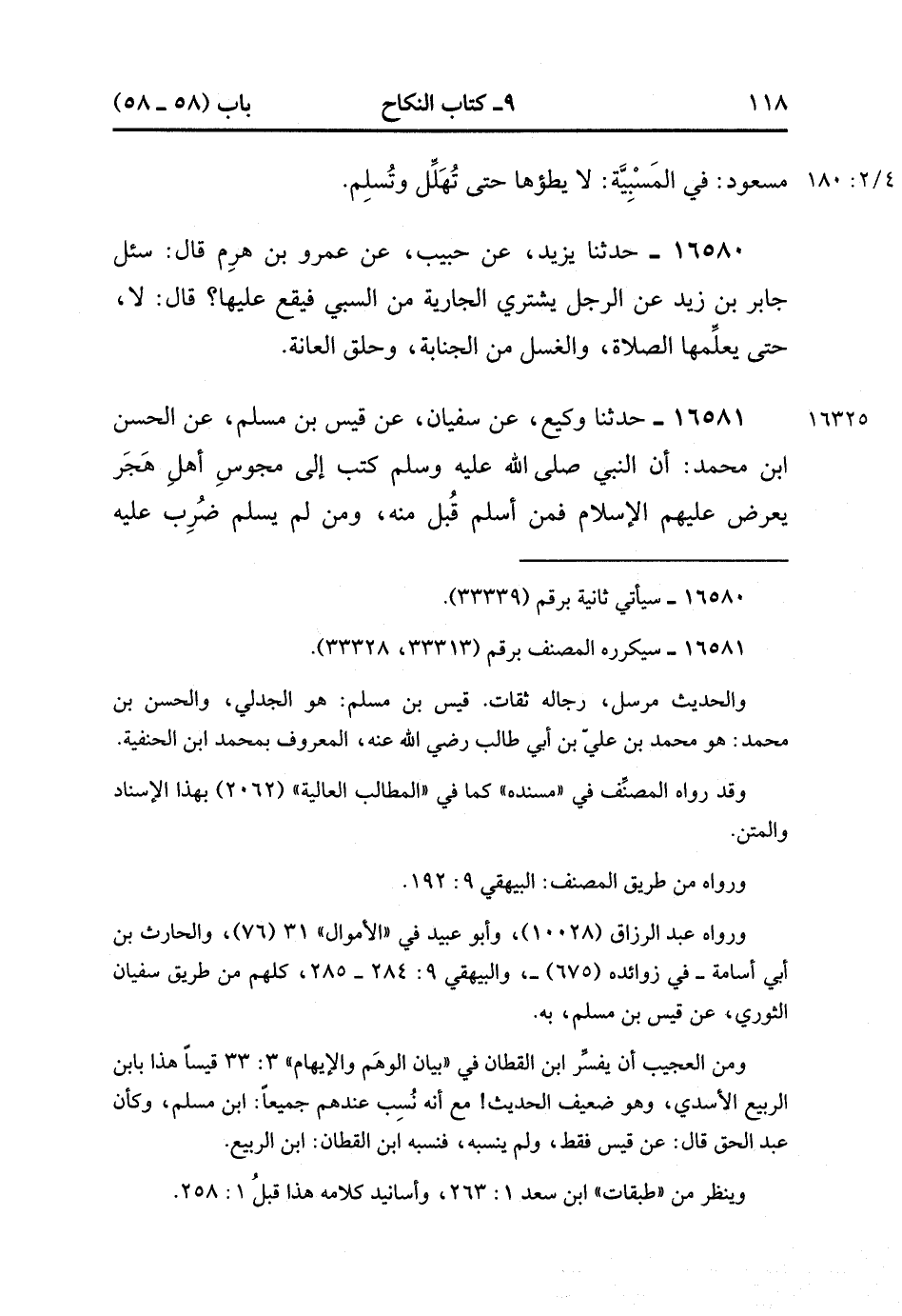16581- حَدَّثَنَا وَكِيعٌ , عَنْ سُفْيَانَ , عَنْ قَيْسِ بْنِ مُسْلِمٍ , عَنِ الْحَسَنِ بْنِ مُحَمَّدٍ أَنَّ النَّبِيَّ صَلَّى الله عَلَيْهِ وَسَلَّمَ كَتَبَ إلَى مَجُوسِ أَهْلِ هَجَرَ يَعْرِضُ عَلَيْهِمَ الإِسْلاَمَ فَمَنْ أَسْلَمَ قَبِلَ مِنْهُ وَمَنْ لَمْ يُسْلِمْ ضَرَبَ عَلَيْهِ الْجِزْيَةَ غَيْرَ نَاكِحِي نِسَائِهِمْ وَلاَ آكِلِي ذَبَائِحِهِمْ. (4/180:2).