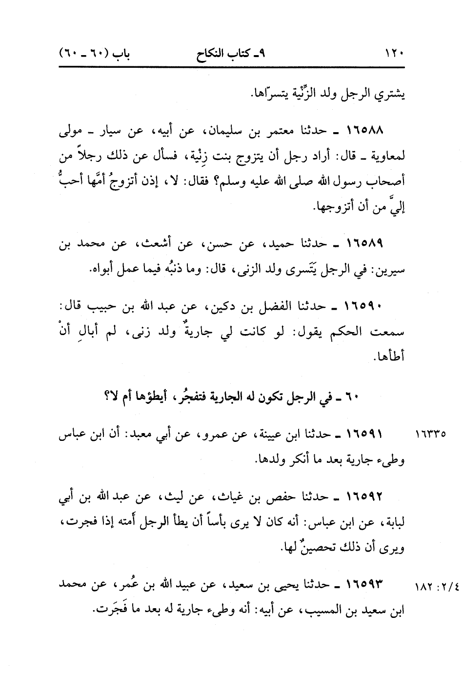16590- حَدَّثَنَا الْفَضْلُ بْنُ دُكَيْنٍ , عَنْ عَبْدِ اللهِ بْنِ حَبِيبٍ ، قَالَ : سَمِعْتُ الْحَكَمَ يَقُولُ : لَوْ كَانَتْ لِي جَارِيَةُ وَلَدِ الزِّنَا لَمْ أُبَالِي أَنْ أَطَأَهَا.