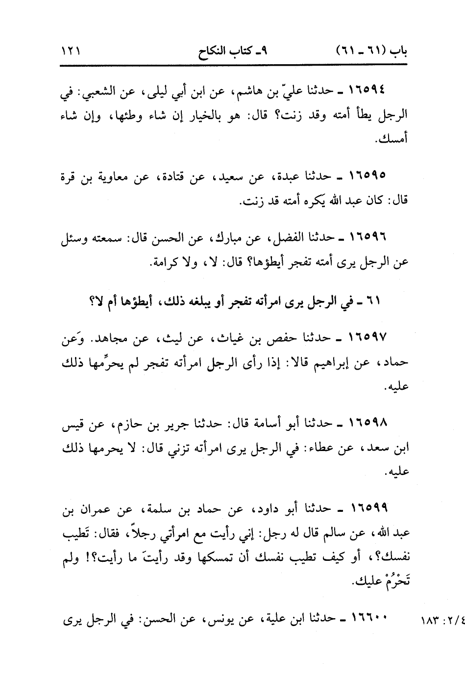 16600- حَدَّثَنَا ابْنُ عُلَيَّةَ , عَنْ يُونُسَ , عَنِ الْحَسَنِ ؛ فِي الرَّجُلِ يَرَى مِنَ امْرَأَتِهِ فَاحِشَةً أَنَّهُ يَكْرَهُ أَنْ يُمْسِكَهَا. (4/182:2).
