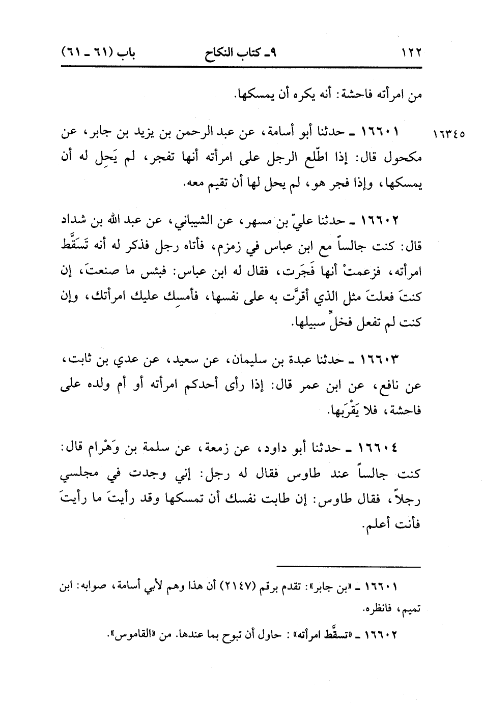 16603- حَدَّثَنَا عَبدَةُ بْنُ سُلَيْمَانَ , عَنْ سَعِيدٍ , عَنْ عَدِيِّ بْنِ ثَابِتٍ , عَنْ نَافِعٍ , عَنِ ابْنِ عُمَرَ ، قَالَ : إذَا رَأَى أَحَدُكُمَ امْرَأَتَهُ ، أَوْ أُمَّ وَلَدِهِ عَلَى فَاحِشَةٍ فَلاَ يَقْرَبْهَا.