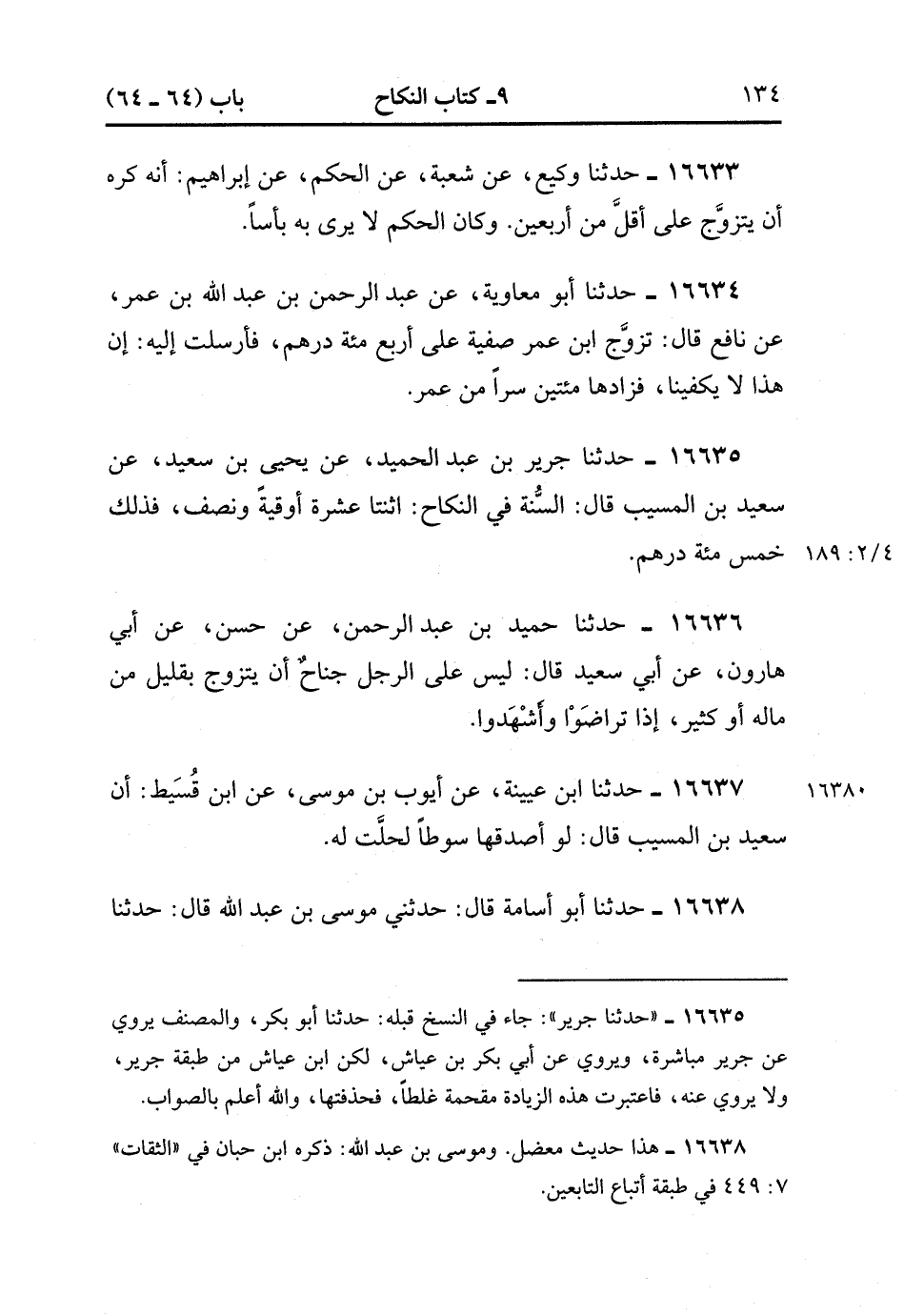 16633- حَدَّثَنَا وَكِيعٌ , عَنْ شُعْبَةَ , عَنِ الْحَكَمِ , عَنْ إبْرَاهِيمَ ، أَنَّهُ كَرِهَ أَنْ يُتَزَوَّجَ عَلَى أَقَلَّ مِنْ أرْبَعِينَ ، وَكَانَ الْحَكَمُ لاَ يَرَى بِهِ بَأْسًا.