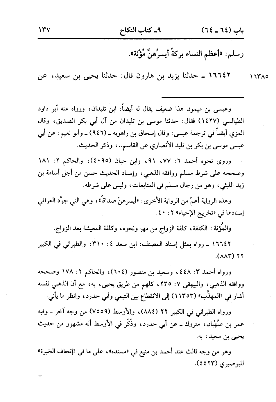 16642- حَدَّثَنَا يَزِيدُ بْنُ هَارُونَ قَالَ : حَدَّثَنَا يَحْيَى بْنُ سَعِيدٍ , عَنْ مُحَمَّدِ بْنِ إبْرَاهِيمَ التَّيْمِيِّ أَنَّ أَبَا حَدْرَدٍ الأَسْلَمِيَّ اسْتَعَانَ رَسُولَ اللهِ صَلَّى الله عَلَيْهِ وَسَلَّمَ فِي مَهْرِ امْرَأَةٍ نَكَحَهَا فَسَأَلَهُ رَسُولُ اللهِ صَلَّى الله عَلَيْهِ وَسَلَّمَ : كَمْ أَصْدَقْتهَا ؟ فَقَالَ : مِئَتَي دِرْهَمٍ ، فَقَالَ رَسُولُ اللهِ صَلَّى الله عَلَيْهِ وَسَلَّمَ : لَوْ كُنْتُمْ تَغْرِفُونَ مِنْ بَطْحَانَ مَا زِدْتُمْ. (4/189:2).