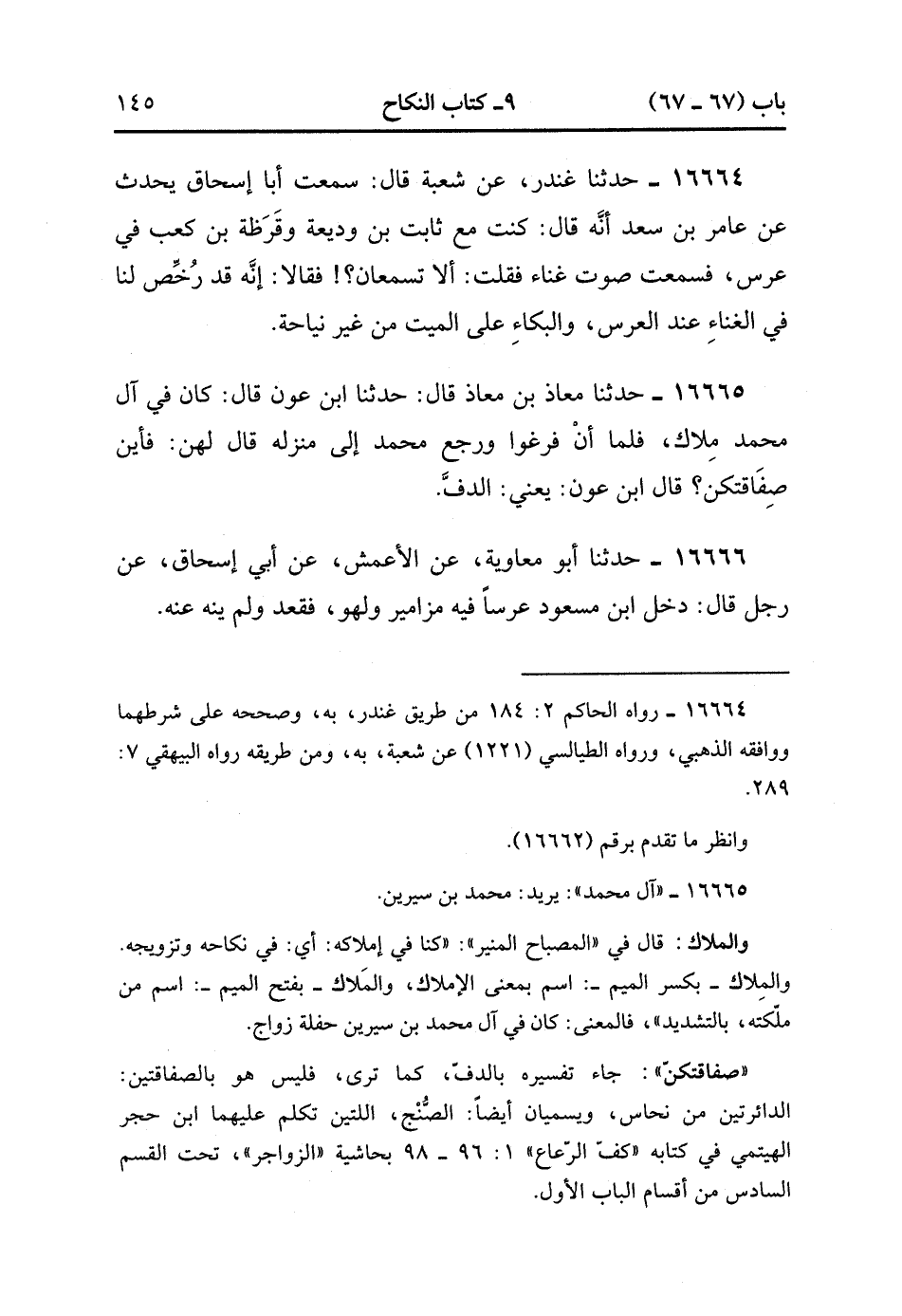 16665- حَدَّثَنَا مُعَاذُ بْنُ مُعَاذٍ , قَالَ : حدَّثَنَا ابْنُ عَوْنٍ قَالَ : كَانَ فِي آلِ مُحَمَّدٍ مِلاَكٌ فَلَمَّا أَنْ فَرَغُوا وَرَجَعَ مُحَمَّدٌ إلَى مَنْزِلِهِ قَالَ لَهُنَّ : فَأَيْنَ صفاقتكن قَالَ ابْنُ عَوْنٍ : يَعْنِيَ الدُّفَّ.
