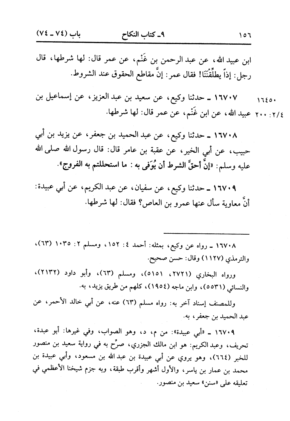 16709- حَدَّثَنَا وَكِيعٌ , عَنْ سُفْيَانَ , عَنْ عَبْدِ الْكَرِيمِ , عَنْ أَبِي عُبَيْدَةَ أَنَّ مُعَاوِيَةَ سَأَلَ عَنْهَا عَمْرَو بْنَ الْعَاصِ , فَقَالَ : لَهَا شَرْطُهَا. (4/200:2).
