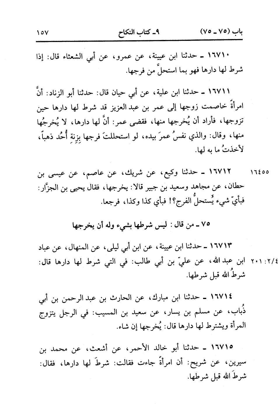 16711- حَدَّثَنَا ابْنُ عُلَيَّةَ , عَنْ أَبِي حَيَّانَ , قَالَ : حدَّثَنَا أَبُو الزِّنَادِ أَنَّ امْرَأَةً خَاصَمَتْ زَوْجَهَا إلَى عُمَرَ بْنِ عَبْدِ الْعَزِيزِ قَدْ شَرَطَ لَهَا دَارَهَا حِينَ تَزَوَّجَهَا فَأَرَادَ أَنْ يُخْرِجَهَا مِنْهَا فَقَضَى عُمَرُ أَنَّ لَهَا دَارَهَا ، لاَ يُخْرِجُهَا مِنْهَا وَقَالَ : وَالَّذِي نَفْسُ عُمَرَ بِيَدِهِ لَوِ اسْتَحْلَلْت فَرْجَهَا بِزِنَةِ أُحُدٍ ذَهَبًا لأَخَذَتُ مَا بِهِ لَهَا.