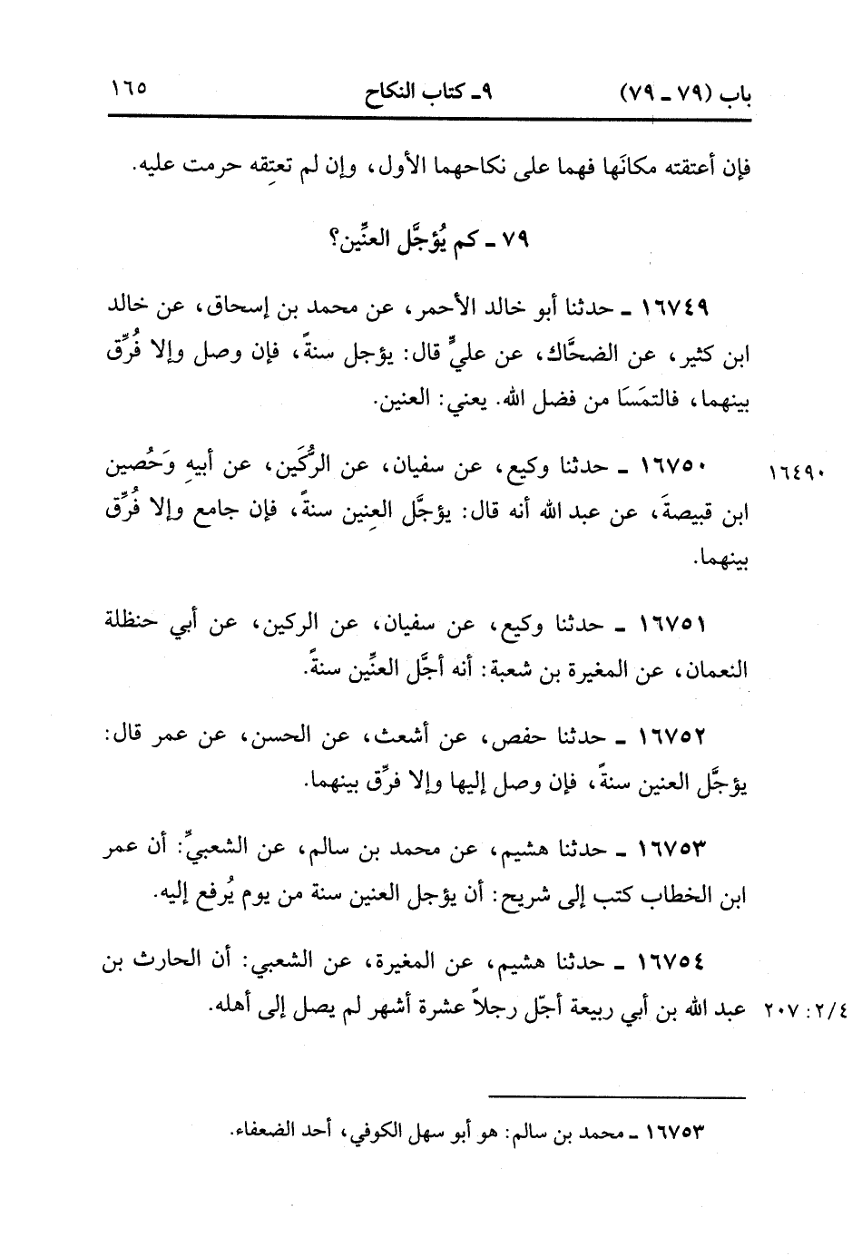 16753- حَدَّثَنَا هُشَيْمٌ , عَنْ مُحَمَّدِ بْنِ سَالِمٍ , عَنِ الشَّعْبِيِّ أَنَّ عُمَرَ بْنَ الْخَطَّابِ كَتَبَ إلَى شُرَيْحٍ أَنْ يُؤَجِّلَ الْعِنِّينِ سَنَةً مِنْ يَوْمِ يُرْفَعُ إليه.