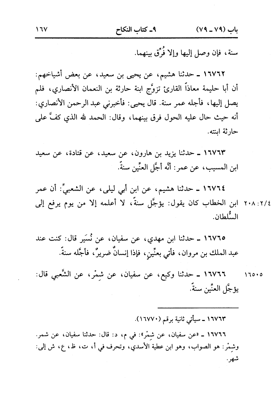 16766- حَدَّثَنَا وَكِيعٌ , عَنْ سُفْيَانَ , عَنْ شِمْر , عَنِ الشَّعْبِيِّ قَالَ : يُؤَجَّلُ الْعِنِّينُ سَنَةً. (4/208:2).