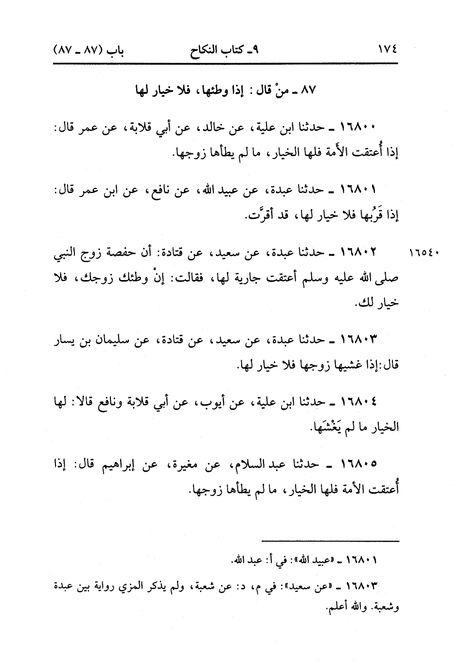 16802- حَدَّثَنَا عَبدَة , عَنْ سَعِيدٍ , عَنْ قَتَادَةَ أَنَّ حَفْصَةَ زَوْجَ النَّبِيِّ صَلَّى الله عَلَيْهِ وَسَلَّمَ أَعْتَقَتْ جَارِيَةً لَهَا , فَقَالَتْ : إِنْ وَطِئَك زَوْجُك فَلاَ خِيَارَ لَك.