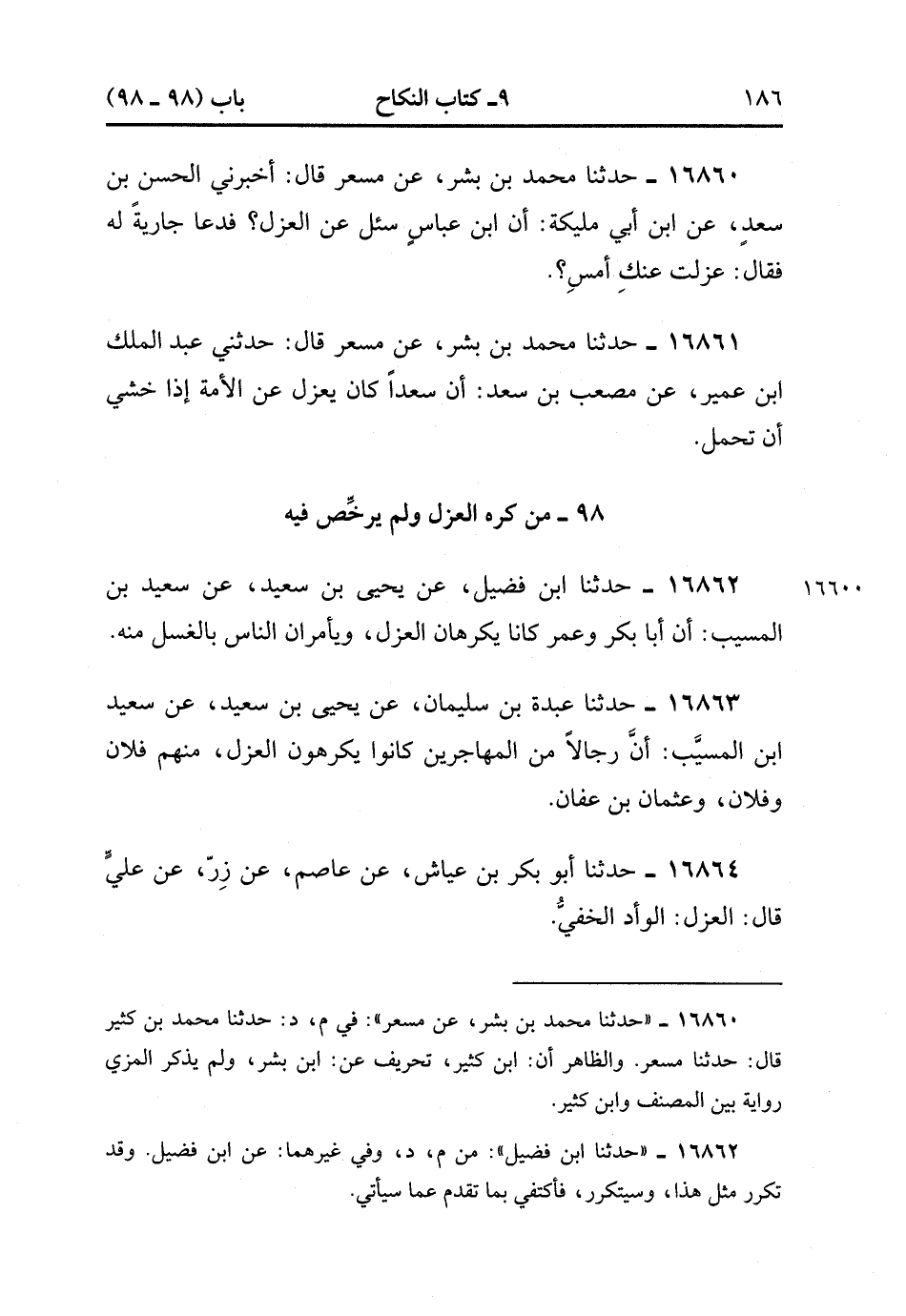 16863- حَدَّثَنَا عَبْدَةُ بْنُ سُلَيْمَانَ , عَنْ يَحْيَى بْنِ سَعِيدٍ , عَنْ سَعِيدِ بْنِ الْمُسَيَّبِ أَنَّ رِجَالاً مِنَ الْمُهَاجِرِينَ كَانُوا يَكْرَهُونَ الْعَزْلَ ، مِنْهُمْ فُلاَنٌ وَفُلاَنٌ وَعُثْمَانُ بْنُ عَفَّانَ.