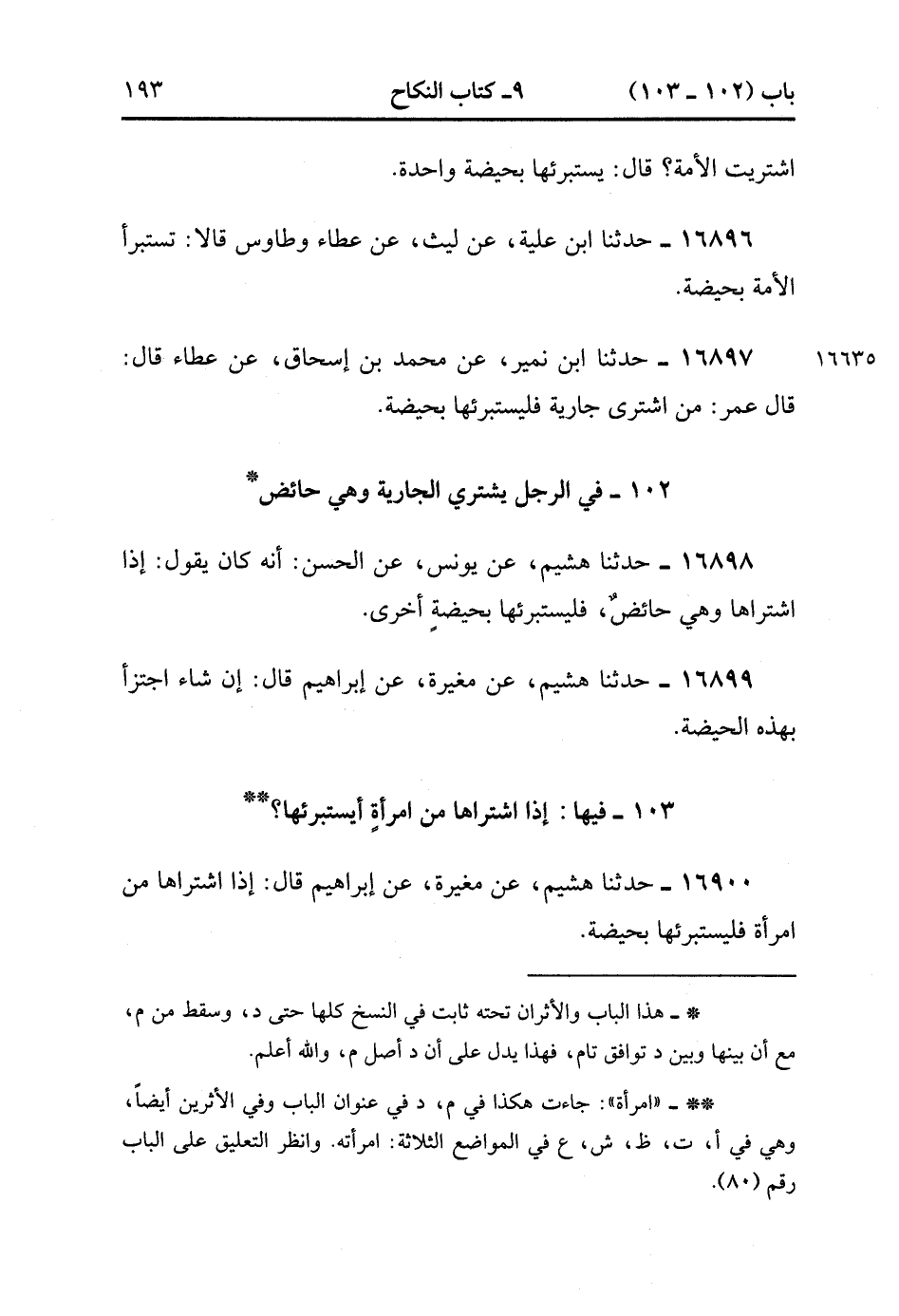 16900- حَدَّثَنَا هِشَامٌ , عَنْ مُغِيرَةَ , عَنْ إبْرَاهِيمَ قَالَ : إذَا اشْتَرَاهَا مِنَ امْرَأَةٍ فَلِيَسْتَبْرِئهَا بِحَيْضَةٍ. (4/225:2).