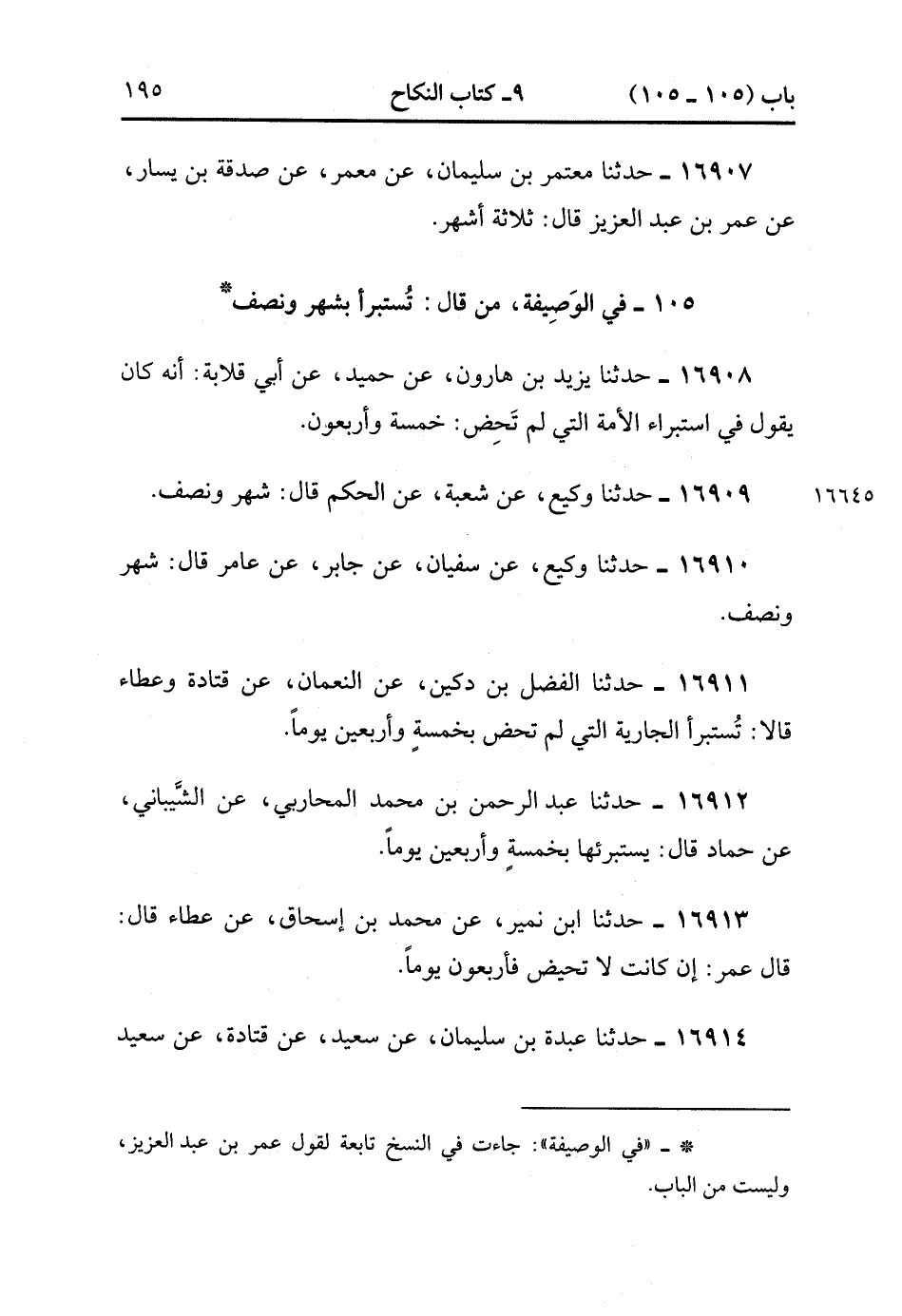 16912- حَدَّثَنَا عبد الرحمن بن محمد الْمُحَارِبِيُّ , عَنِ الشَّيْبَانِيِّ , عَنْ حَمَّادٍ قَالَ : يَسْتَبْرِئُهَا بِخَمْسَةٍ وَأَرْبَعِينَ يَوْمًا.