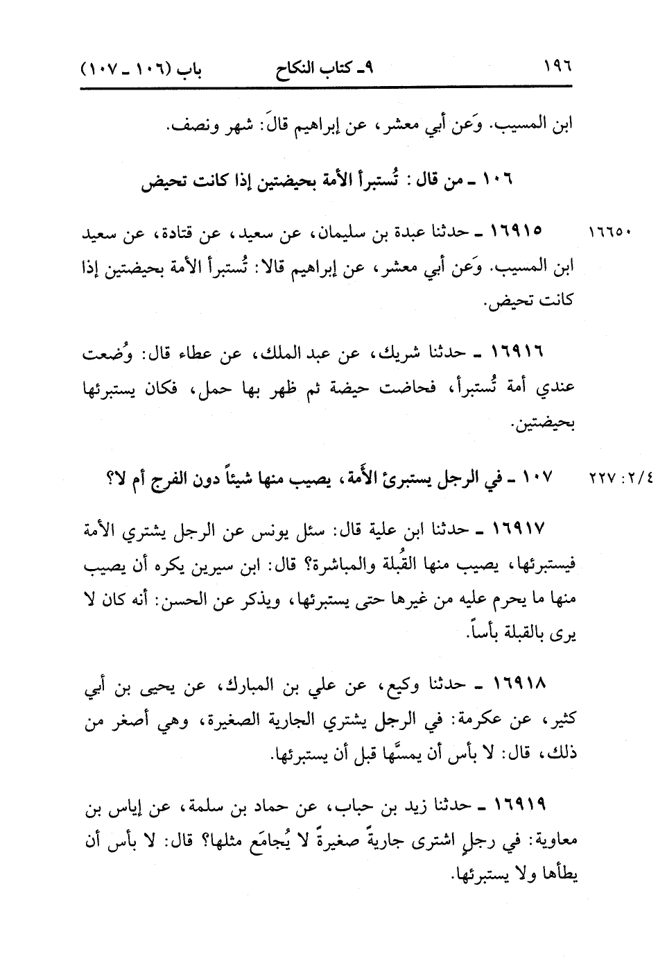 16919- حَدَّثَنَا زَيْدُ بْنُ حُبَابٍ , عَنْ حَمَّادِ بْنِ سَلَمَةَ , عَنْ إيَاسِ بْنِ مُعَاوِيَةَ فِي رَجُلٍ اشْتَرَى جَارِيَةً صَغِيرَةً لاَ يُجَامَعُ مِثْلُهَا ؟ قَالَ : لاَ بَأْسَ أَنْ يَطَأَهَا وَلاَ يَسْتَبْرِئُهَا. (4/227:2).