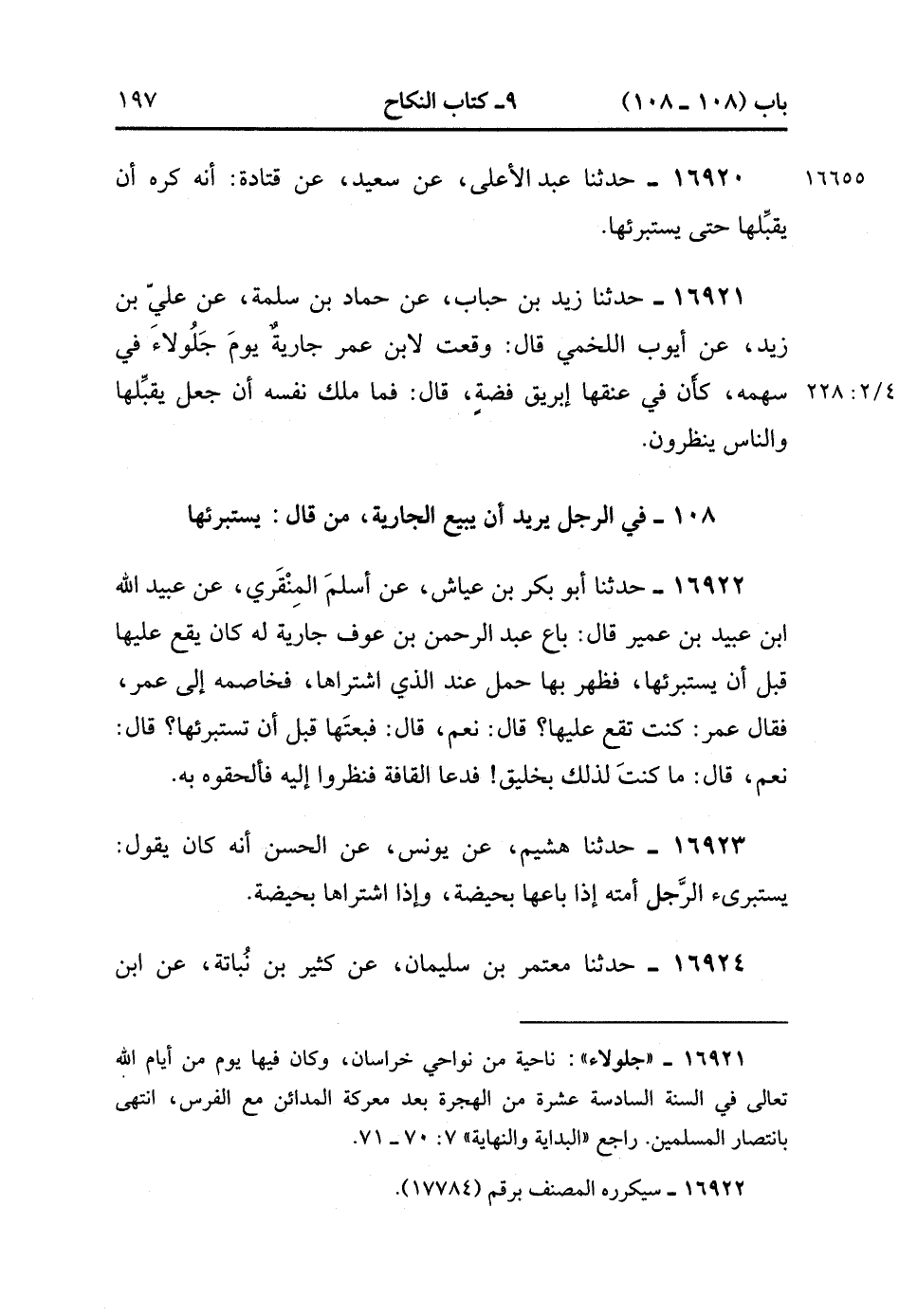 16921- حَدَّثَنَا زَيْدُ بْنُ حُبَابٍ , عَنْ حَمَّادِ بْنِ سَلَمَةَ , عَنْ عَلِيِّ بْنِ زَيْدٍ , عَنْ أَيُّوبَ اللَّخْمِيِّ قَالَ : وَقَعَتْ لابْنِ عُمَرَ جَارِيَةٌ يَوْمَ جَلُولاَءَ فِي سَهْمِهِ ، كَأَنَّ فِي عُنُقِهَا إبْرِيقَ فِضَّةٍ قَالَ : فَمَا مَلَكَ نَفْسَهُ أَنْ جَعَلَ يُقَبِّلُهَا وَالنَّاسُ يَنْظُرُونَ. (4/227:2)