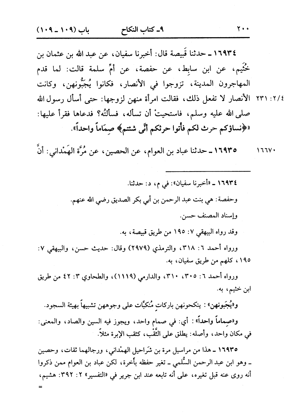 16935- حَدَّثَنَا عَبَّادُ بْنُ الْعَوَّامِ , عَنِ الْحُصَيْنِ , عَنْ مُرَّةَ الْهَمْدَانِيِّ أَنَّ بَعْضَ الْيَهُودِ لقي بَعْضَ الْمُسْلِمِينَ قَالَ : تَأْتُونَ النِّسَاءَ وَرَاءَهُنَّ ؟ قَالَ : كَأَنَّهُ كَرِهَ الإِبْرَاكَ قَالَ : فَذَكَرُوا ذَلِكَ فَنَزَلَتْ هَذِهِ الآيَةُ : {نِسَاؤُكُمْ حَرْثٌ لَكُمْ فَأْتُوا حَرْثَكُمْ أَنَّى شِئْتُمْ} فَرَخَّصَ اللَّهُ لِلْمُسْلِمِينَ أَنْ يَأْتُوا النِّسَاءَ فِي الْفُرُوجِ كَيْفَ شَاؤُوا وأنى شَاؤُوا مِنْ بَيْنِ أَيْدِيهِنَّ ، وَإِنْ شَاؤُوا مِنْ خَلْفِهِنَّ. (4/231:2).