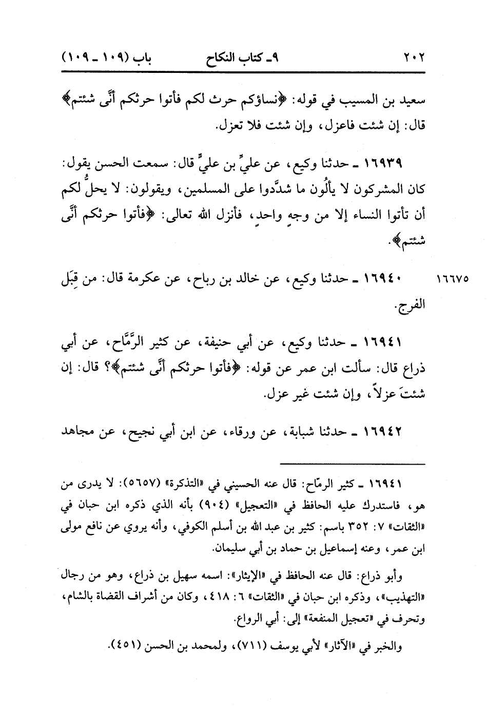 16941- حَدَّثَنَا وَكِيعٌ , عَنْ أَبِي حَنِيفَةَ , عَنْ كَثِيرٍ الرَّمَّاحِ , عَنْ أَبِي ذِرَاعٍ قَالَ : سَأَلْتُ ابْنَ عُمَرَ , عَنْ قَوْلِهِ : {فَأْتُوا حَرْثَكُمْ أَنَّى شِئْتُمْ} قَالَ : إِنْ شِئْتَ عَزْلاً ، وَإِنْ شِئْتَ غَيْرُ عَزْلٍ.