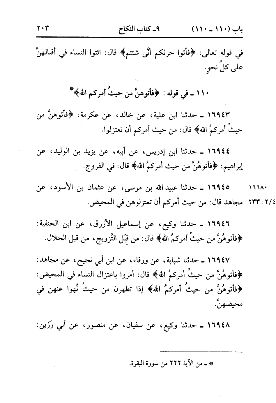 16948- حَدَّثَنَا وَكِيعٌ , عَنْ سُفْيَانَ , عَنْ مَنْصُورٍ , عَنْ أَبِي رَزِينٍ : فَأْتُوهُنَّ مِنْ حَيْثُ أَمَرَكُمُ اللَّهُ قَالَ : مِنْ قِبَلِ الطُّهْرِ. (4/233:2).