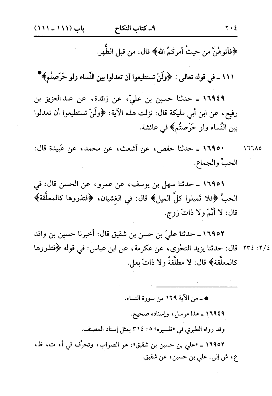 111 - فِي قَوْلِهِ تَعَالَى : {وَلَنْ تَسْتَطِيعُوا أَنْ تَعْدِلُوا بَيْنَ النِّسَاءِ وَلَوْ حَرَصْتُمْ}.
