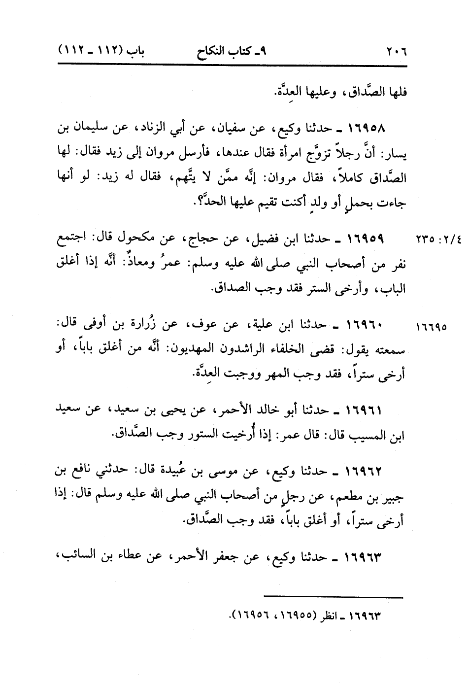 16958- حَدَّثَنَا وَكِيعٌ , عَنْ سُفْيَانَ , عَنْ أَبِي الزِّنَادِ , عَنْ سُلَيْمَانَ بْنِ يَسَارٍ أَنَّ رَجُلاً تَزَوَّجَ امْرَأَةً , فَقَالَ عِنْدَهَا فَأَرْسَلَ مَرْوَانُ إلَى زَيْدٍ , فَقَالَ : لَهَا الصَّدَاقُ كَامِلاً ، فَقَالَ مَرْوَانُ : إنَّهُ مِمَّنْ لاَ يُتَّهَمُ ، فَقَالَ لَهُ زَيْدٌ : لَوْ أَنَّهَا جَاءَتْ بِحَمْلٍ ، أَوْ بِوَلَدٍ أَكُنْت تُقِيمُ عَلَيْهَا الْحَدَّ ؟. (4/234:2)