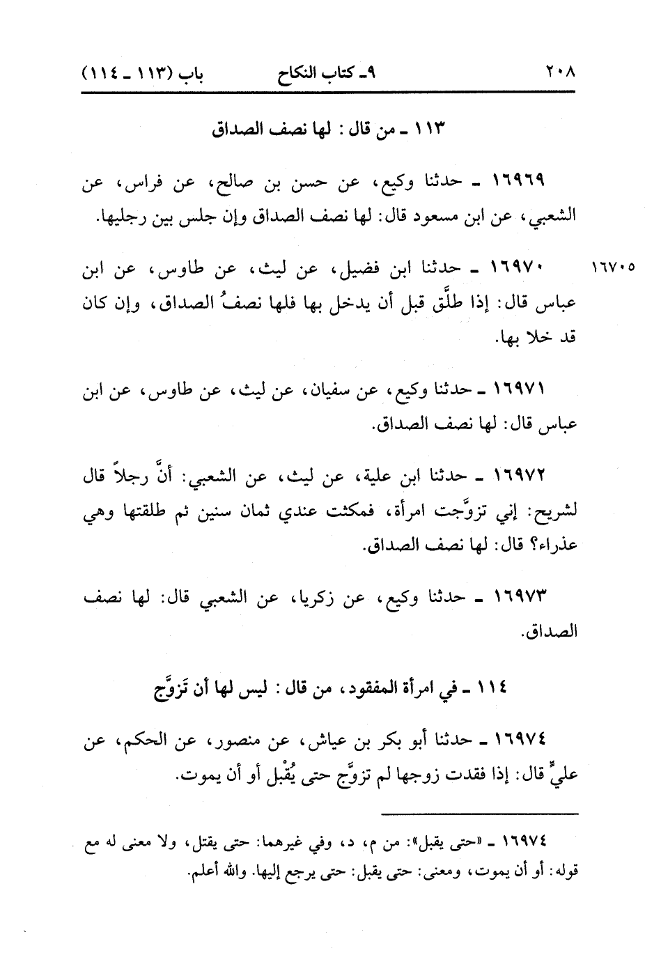 16973- حَدَّثَنَا وَكِيعٌ , عَنْ زَكَرِيَّا , عَنِ الشَّعْبِيِّ قَالَ : لَهَا نِصْفُ الصَّدَاقِ.