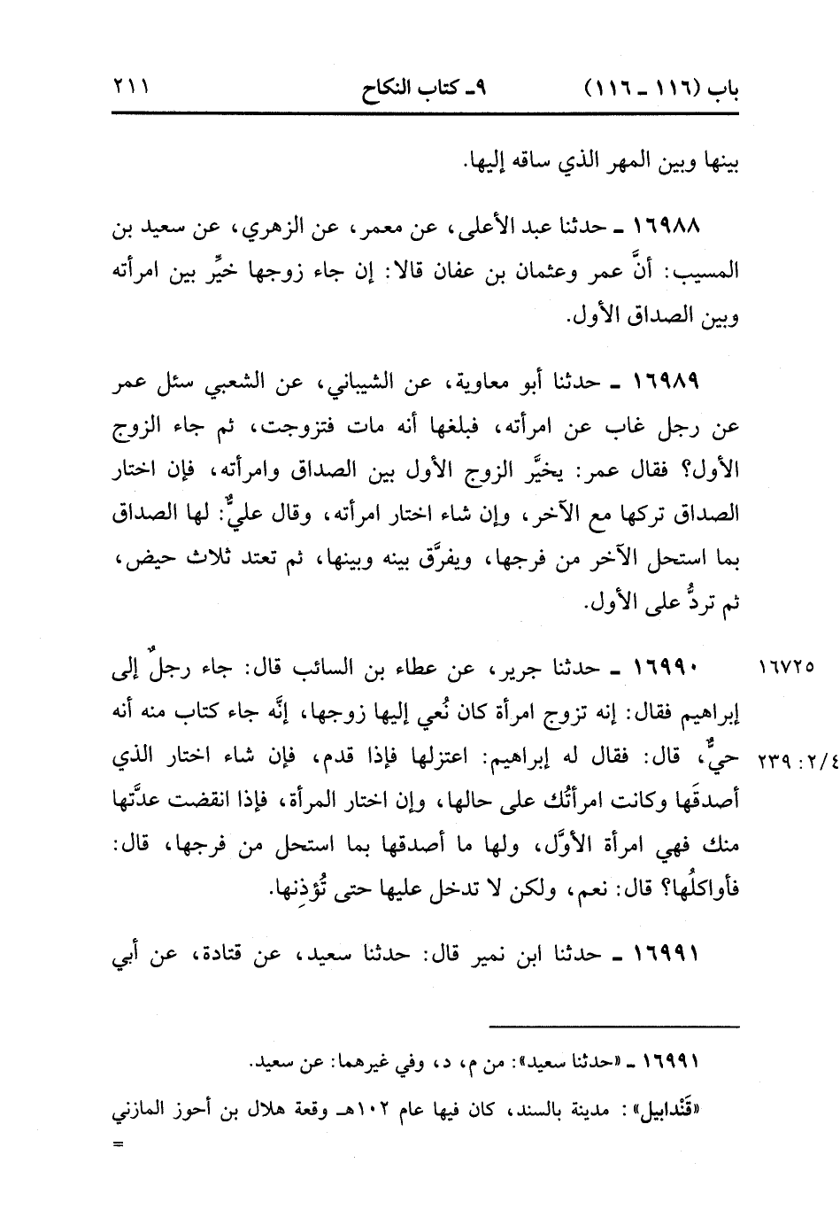 16990- حَدَّثَنَا جَرِيرٌ , عَنْ عَطَاءِ بْنِ السَّائِبِ قَالَ : جَاءَ رَجُلٌ إلَى إبْرَاهِيمَ , فَقَالَ : إنَّهُ تَزَوَّجَ امْرَأَةً كَانَ نُعِيَ إلَيْهَا زَوْجُهَا ، إِنَّهُ جَاءَ كِتَابٌ مِنْهُ أَنَّهُ حَيٌّ ، فَقَالَ له إبْرَاهِيمُ : اعْتَزِلْهَا فَإِذَا قَدِمَ فَإِنْ شَاءَ اخْتَارَ الَّذِي أَصْدَقَهَا وكَانَت امْرَأَتَكَ عَلَى حَالِهَا ، وَإِنِ اخْتَارَ الْمَرْأَةَ فَإِذا انْقَضَتْ عِدَّتُهَا مِنْك فَهِيَ أمْرَأَةُ الأَوَّلِ وَلَهَا مَا أَصْدَقَهَا بِمَا اسْتَحَلَّ مِنْ فَرْجِهَا قَالَ : فَأُواكِلُهَا ؟ قَالَ : نَعَمْ وَلاَ تَدْخُلُ عَلَيْهَا حَتَّى تُؤْذِنَهَا. (4/238:2).
