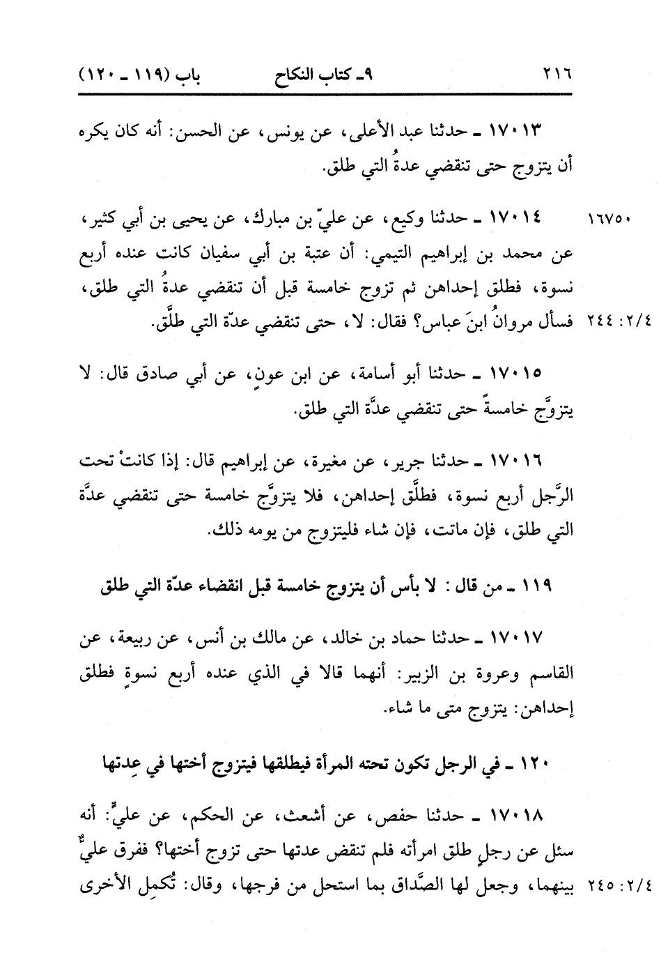 17014- حَدَّثَنَا وَكِيعٌ , عَنْ عَلِيِّ بْنِ مُبَارَكٍ , عَنْ يَحْيَى بْنِ أَبِي كَثِيرٍ , عَنْ مُحَمَّدِ بْنِ إبْرَاهِيمَ التَّيْمِيِّ أَنَّ عُتْبَةَ بْنَ أَبِي سُفْيَانَ كَانَتْ عِنْدَهُ أَرْبَعُ نِسْوَةٍ فَطَلَّقَ إحْدَاهُنَّ ثُمَّ تَزَوَّجَ خَامِسَةً قَبل أَن تَنْقَضِيَ عِدَّةُ الَّتِي طَلَّقَ فَسَأَلَ مَرْوَانُ ابْنَ عَبَّاسٍ , فَقَالَ : لاَ حَتَّى تَنْقَضِيَ عِدَّةُ الَّتِي طَلَّقَ. (4/243:2)