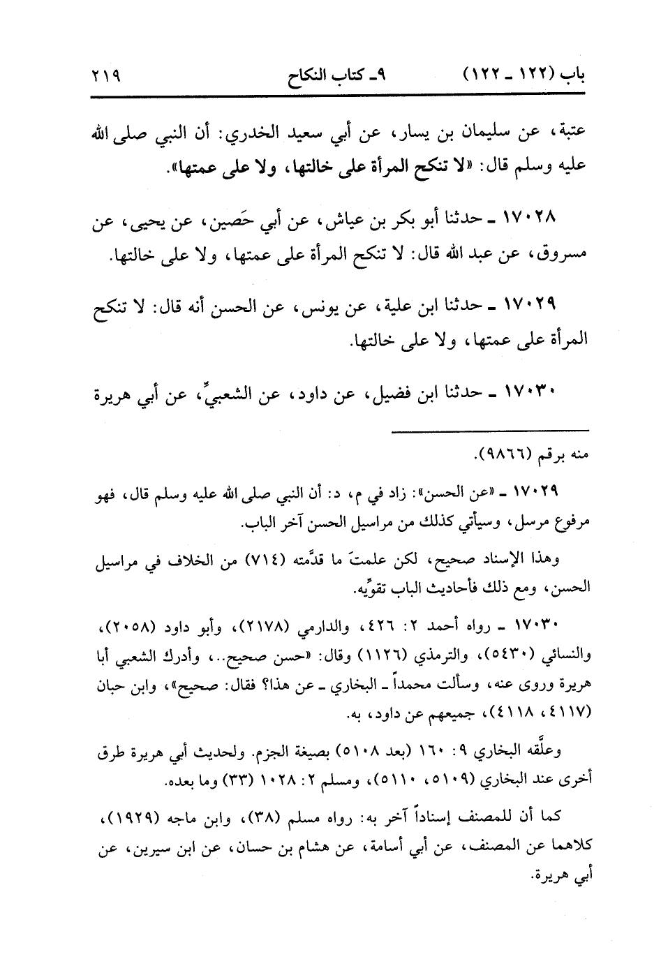 17030- حَدَّثَنَا ابْنُ فُضَيْلٍ , عَنْ دَاوُدَ , عَنِ الشَّعْبِيِّ , عَنْ أَبِي هُرَيْرَةَ ، قَالَ : قَالَ رَسُولُ اللهِ صَلَّى الله عَلَيْهِ وَسَلَّمَ : لاَ تُنْكَحُ الْمَرْأَةُ عَلَى عَمَّتِهَا وَلاَ عَلَى خَالَتِهَا وَلاَ تُنْكَحُ الْعَمَّةُ عَلَى بِنْتِ أخيها وَلاَ الْخَالَةُ عَلَى بِنْتِ أُخْتِهَا وَلاَ تُزَوَّجُ الصُّغْرَى عَلَى الْكُبْرَى وَلاَ الْكُبْرَى عَلَى الصُّغْرَى. (4/246:2).