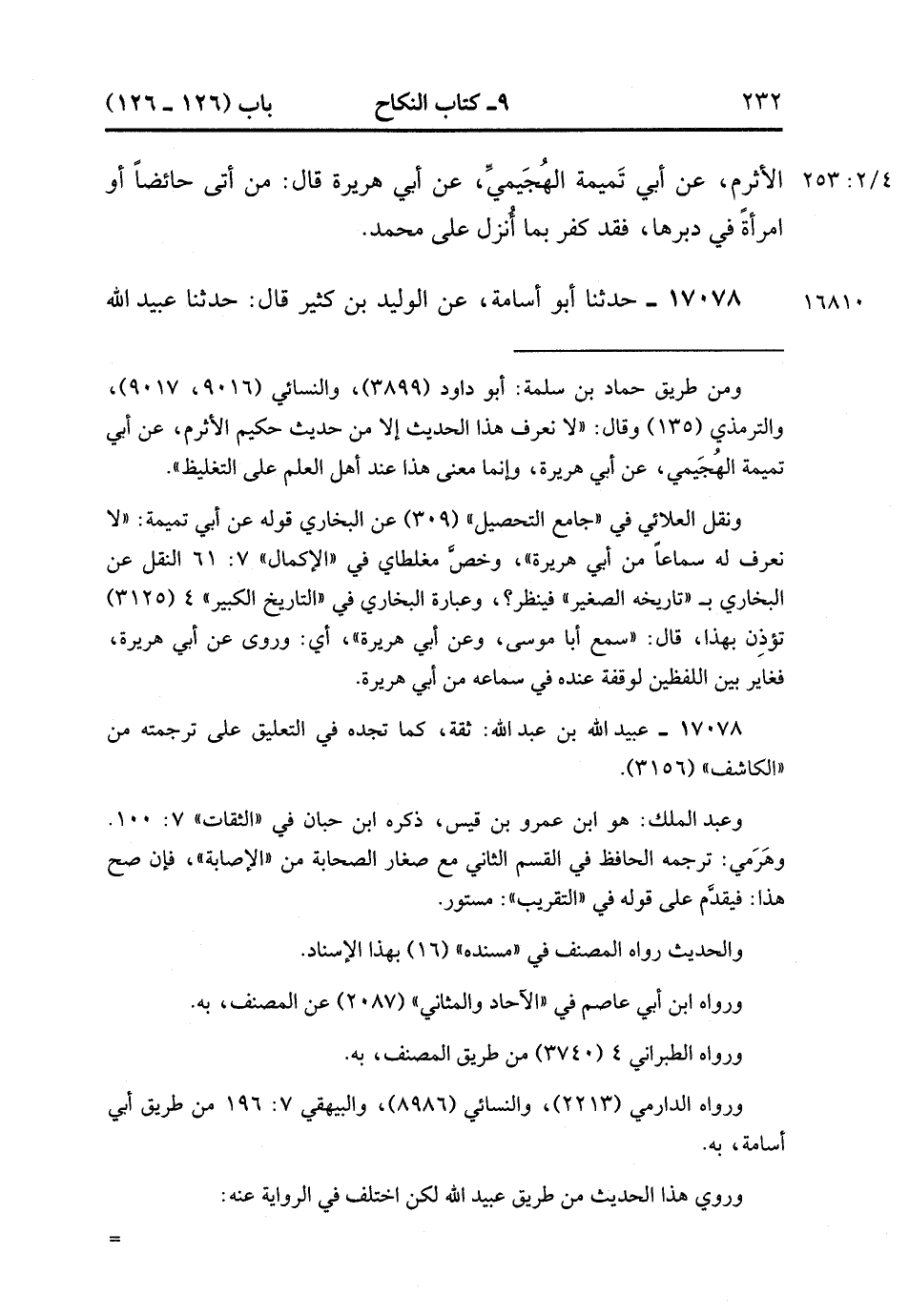 17077- حَدَّثَنَا الْفَضْلُ بْنُ دُكَيْنٍ , عَنْ حَمَّادِ بْنِ سَلَمَةَ , عَنْ حَكِيمٍ الأَثْرَمِ , عَنْ أَبِي تَمِيمَةَ الْهُجَيْمِيِّ , عَنْ أَبِي هُرَيْرَةَ قَالَ : مَنْ أَتَى حَائِضًا ، أَوِ امْرَأَةً فِي دُبُرِهَا فَقَدْ كَفَرَ بِمَا أُنْزِلَ عَلَى مُحَمَّدٍ صَلَّى الله عَلَيْهِ وَسَلَّمَ . (4/252:2).