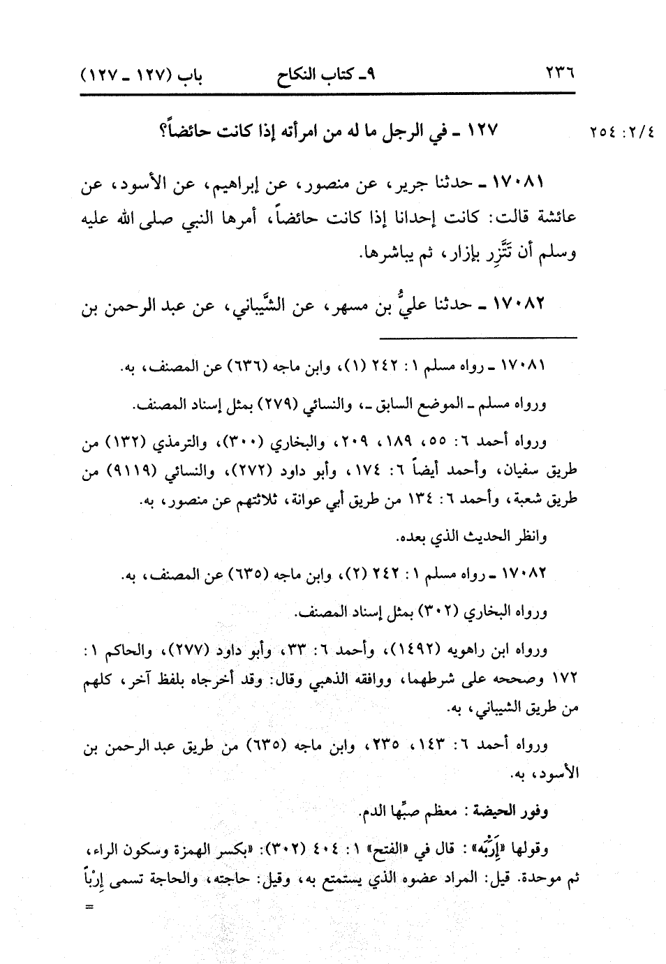 17082- حَدَّثَنَا عَلِيُّ بْنُ مُسْهِرٍ , عَنِ الشَّيْبَانِيِّ , عَنْ عَبْدِ الرَّحْمَنِ بْنِ الأَسْوَدِ , عَنْ أَبِيهِ , عَنْ عَائِشَةَ قَالَتْ : كَانَتْ إحْدَانَا إذَا كَانَتْ حَائِضًا أَمَرَهَا النَّبِيُّ صَلَّى الله عَلَيْهِ وَسَلَّمَ أَنْ تَأْتَزِرَ فِي فور حَيْضَتِهَا ثُمَّ يُبَاشِرُهَا ، وَأَيُّكُمْ يَمْلِكُ إرْبَهُ كَمَا كَانَ رَسُولُ اللهِ صَلَّى الله عَلَيْهِ وَسَلَّمَ يَمْلِكُ إرْبَهُ. (4/254:2).