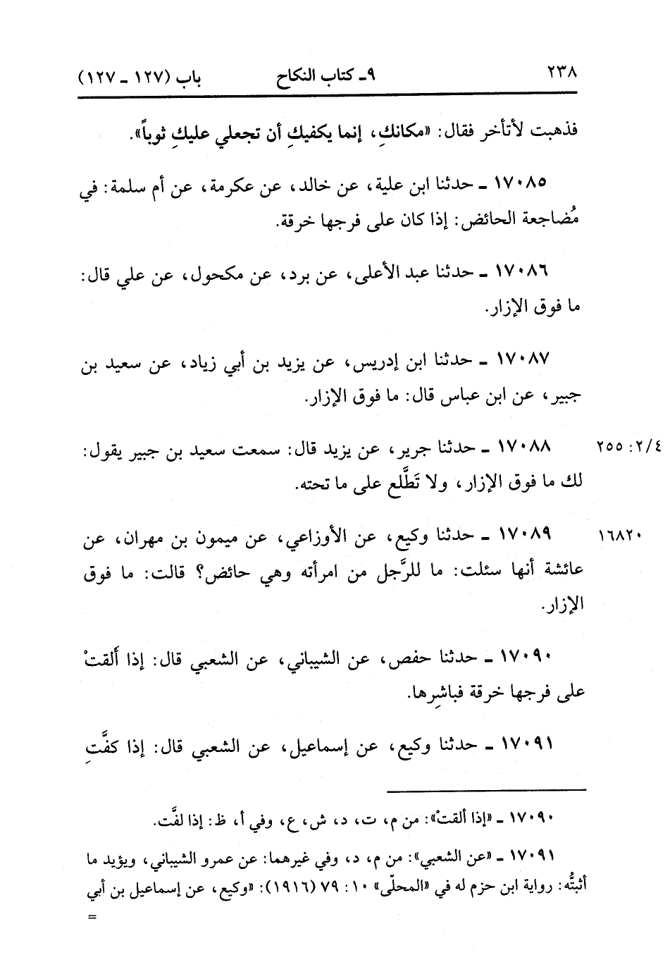 17091- حَدَّثَنَا وَكِيعٌ , عَنْ إسْمَاعِيلَ , عَنِ الشَّيْبَانِيِّ قَالَ : إذَا كَفَّتِ الْحَائِضَةُ عَنْهَا الأَذَى فَاصْنَعْ بِهَا مَا شِئْتَ. (4/255:2).