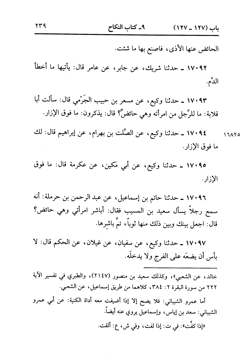 17093- حَدَّثَنَا وَكِيعٌ , عَنْ مِسْعَرِ بْنِ حَبِيبٍ الْجَرْمِيِّ قَالَ : سَأَلْتُ أَبَا قِلاَبَةَ : مَا لِلرَّجُلِ مِنَ امْرَأَتِهِ وَهِيَ حَائِضٌ ؟ قَالَ : يَذْكُرُونَ مَا فَوْقَ الإِزَارِ.