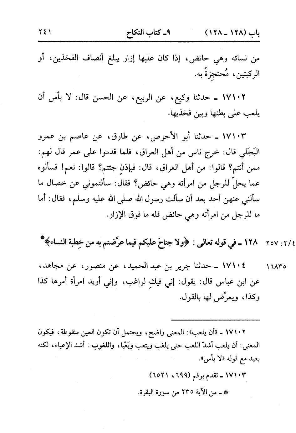 17104- حَدَّثَنَا جَرِيرُ بْنُ عَبْدِ الْحَمِيدِ , عَنْ مَنْصُورٍ , عَنْ مُجَاهِدٍ , عَنِ ابْنِ عَبَّاسٍ ، قَالَ : يَقُولُ : إنِّي فِيك لرَاغِبٌ وَإِنِّي أُرِيدُ امْرَأَةً أَمْرُهَا كَذَا وَكَذَا وَيُعَرِّضُ لَهَا بِالْقَوْلِ. (4/257:2).