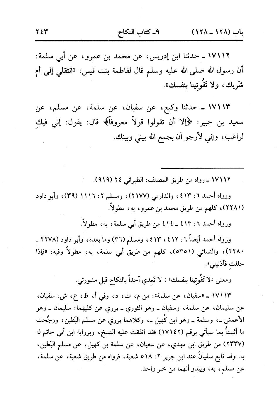 17112- حَدَّثَنَا ابْنُ إدْرِيسَ , عَنْ مُحَمَّدِ بْنِ عَمْرٍو , عَنْ أَبِي سَلَمَةَ ، أَنَّ رَسُولَ اللهِ صَلَّى الله عَلَيْهِ وَسَلَّمَ قَالَ لِفَاطِمَةَ بِنْتِ قَيْسٍ : انْتَقِلِي إلَى أُمِّ شَرِيكٍ وَلاَ تَفُوتِينَا بِنَفْسِكِ.