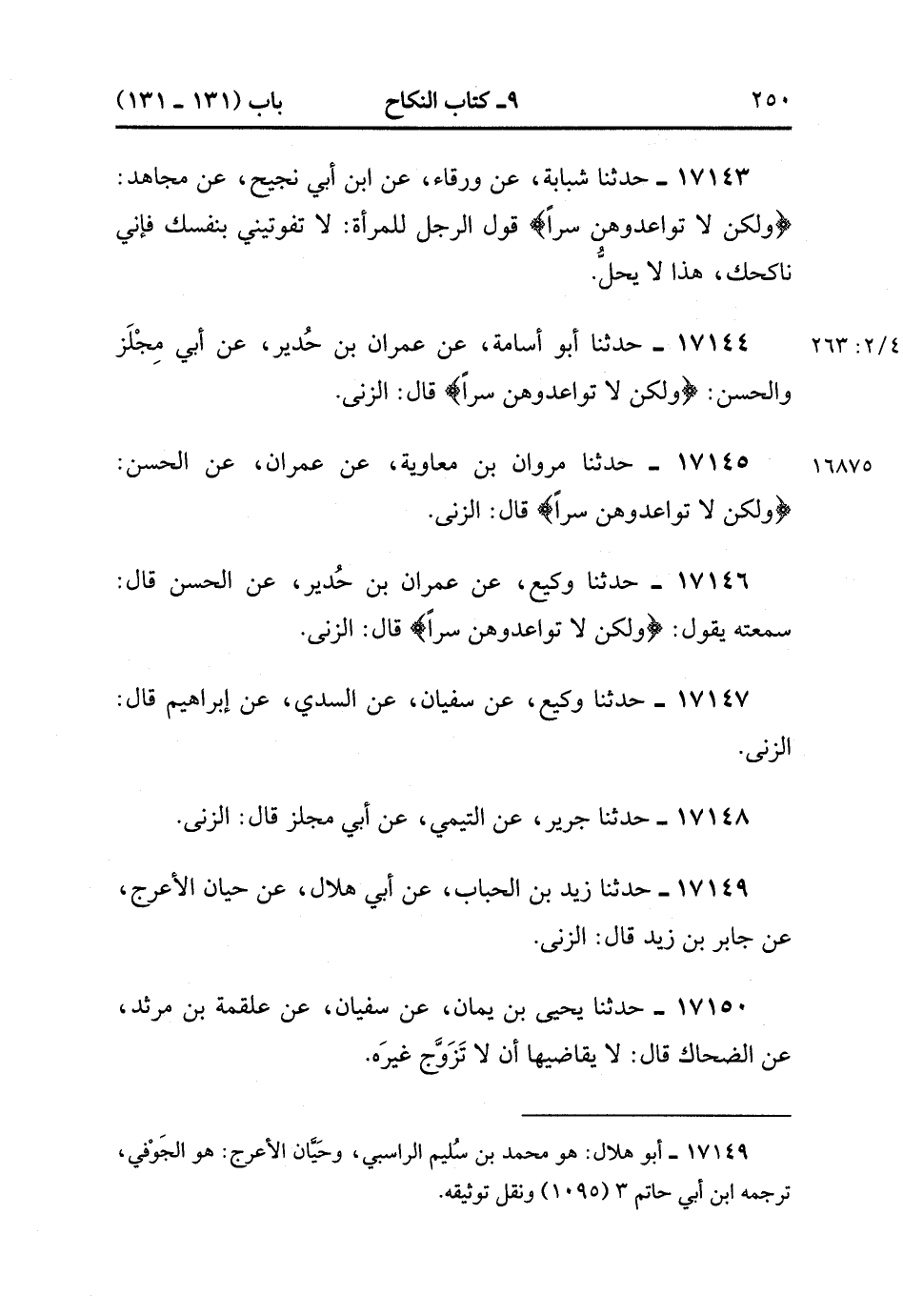 17145- حَدَّثَنَا مَرْوَانُ بْنُ مُعَاوِيَةَ , عَنْ عِمْرَانَ , عَنِ الْحَسَنِ : {وَلَكِنْ لاَ تُوَاعِدُوهُنَّ سِرًّا} قَالَ : الزِّنَا.