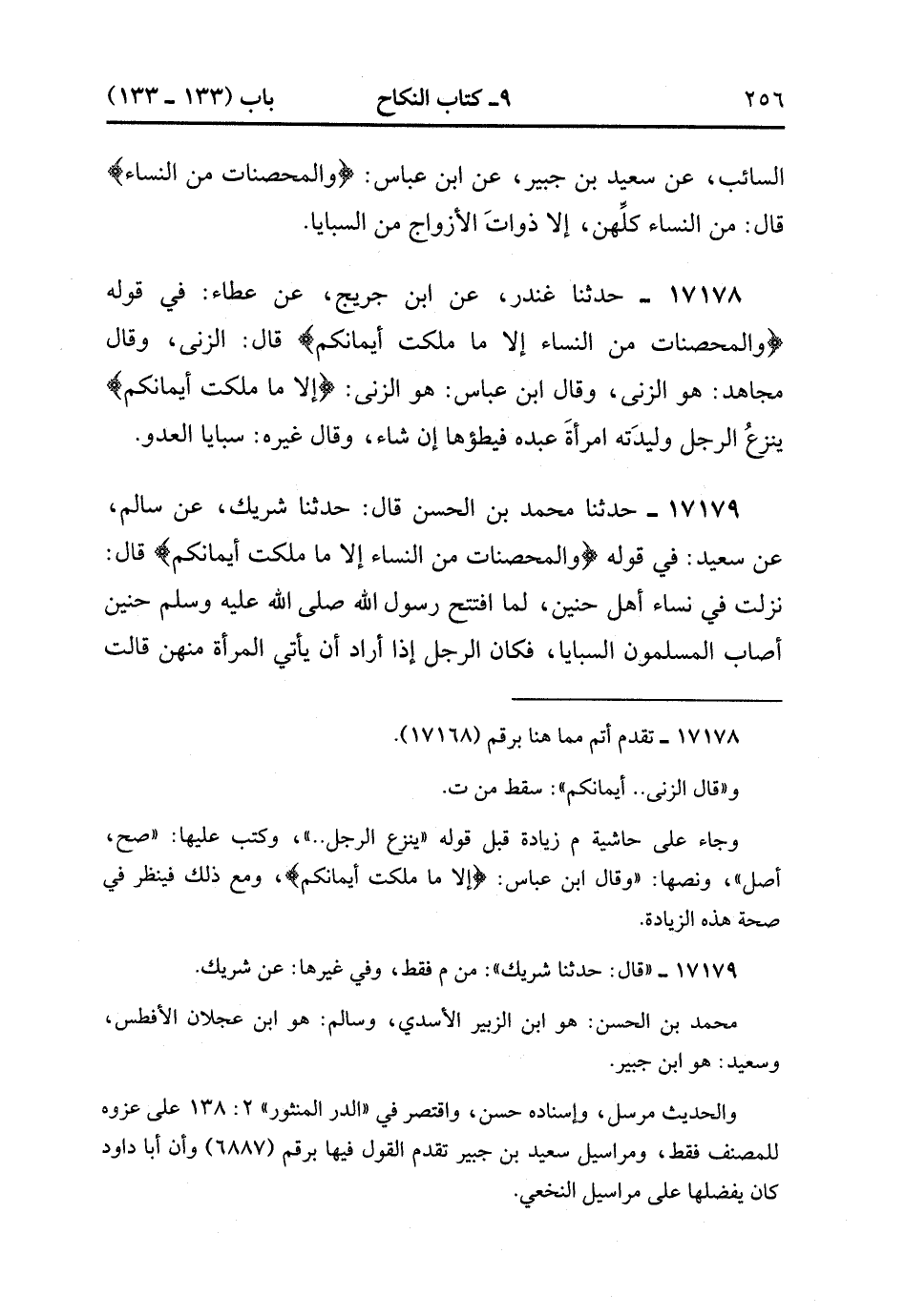 17179- حَدَّثَنَا مُحَمَّدُ بْنُ الْحَسَنِ قَالَ : حَدَّثَنَا شَرِيكٍ , عَنْ سَالِمٍ , عَنْ سَعِيدٍ فِي قَوْلِهِ : {وَالْمُحْصَنَاتُ مِنَ النِّسَاءِ إلاَّ مَا مَلَكَتْ أَيْمَانُكُمْ} قَالَ : نَزَلَتْ فِي نِسَاءِ أَهْلِ حُنَيْنٍ ، لَمَّا افْتَتَحَ رَسُولُ اللهِ صَلَّى الله عَلَيْهِ وَسَلَّمَ حُنَيْنًا أَصَابَ الْمُسْلِمُونَ السَّبَايَا ، فَكَانَ الرَّجُلُ إذَا أَرَادَ أَنْ يَأْتِيَ الْمَرْأَةَ مِنْهُنَّ قَالَتْ : إنَّ لِي زَوْجًا فَأَتَوْا النَّبِيَّ صَلَّى الله عَلَيْهِ وَسَلَّمَ فَذَكَرُوا ذَلِكَ لَهُ فَأَنْزَلَ اللَّهُ تَعَالَى : {وَالْمُحْصَنَاتُ مِنَ النِّسَاءِ إلاَّ مَا مَلَكَتْ أَيْمَانُكُمْ} قَالَ : السَّبَايَا مِنْ ذَوَاتِ الأَزْوَاجِ. (4/268:2).
