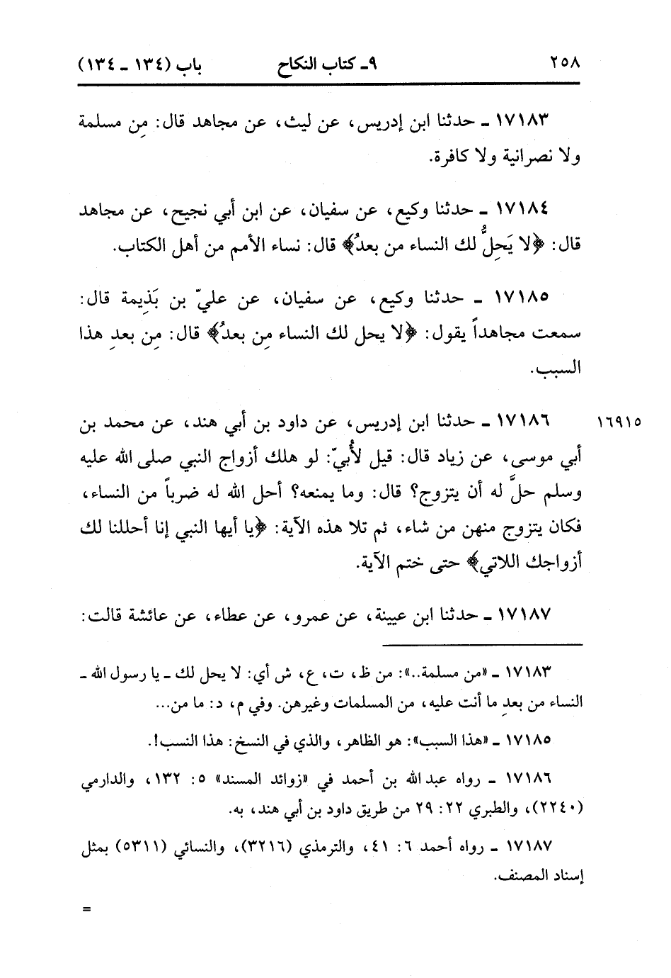 17184- حَدَّثَنَا وَكِيعٌ , عَنْ سُفْيَانَ , عَنِ ابْنِ أَبِي نَجِيحٍ , عَنْ مُجَاهِدٍ قَالَ : {لاَ يَحِلُّ لَكَ النِّسَاءُ مِنْ بَعْدُ} قَالَ : نِسَاءُ الأُمَمِ مِنْ أَهْلِ الْكِتَابِ.