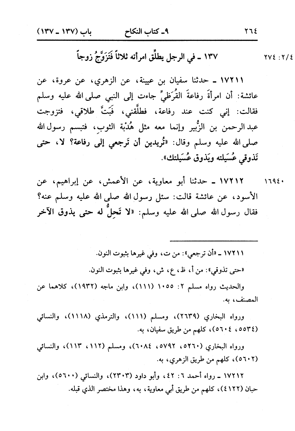 17212- حَدَّثَنَا أبو مُعَاوِيَةَ , عَنِ الأَعْمَشِِ , عَنْ إبْرَاهِيمَ , عَنِ الأَسْوَدِ , عَنْ عَائِشَةَ قَالَتْ : سُئِلَ رَسُولُ اللهِ صَلَّى الله عَلَيْهِ وَسَلَّمَ عَنْهُ , فَقَالَ رَسُولُ اللهِ صَلَّى الله عَلَيْهِ وَسَلَّمَ : لاَ تحل له حَتَّى يَذُوقَ الآخر عُسَيْلَتَهَا وَتَذُوقَ عُسَيْلَتَهُ. (4/274:2).