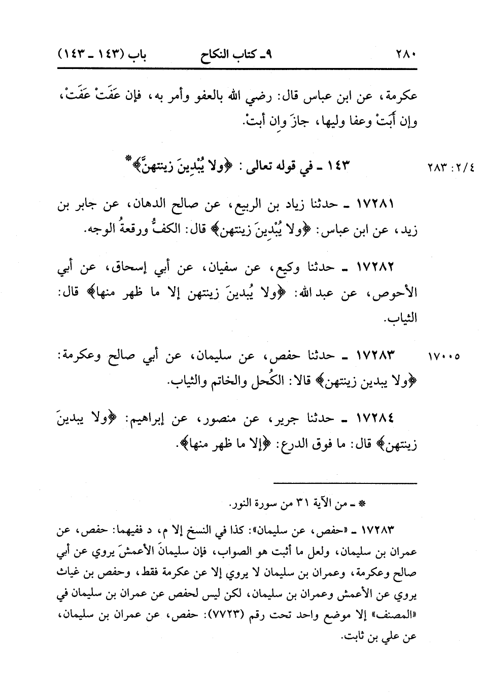 17284- حَدَّثَنَا جَرِيرٌ , عَنْ مَنْصُورٍ , عَنْ إبْرَاهِيمَ {وَلاَ يُبْدِينَ زِينَتَهُنَّ} قَالَ : مَا فَوْقَ الدِّرْعِ إلاَّ مَا ظَهَرَ مِنْهَا. (4/283:2).