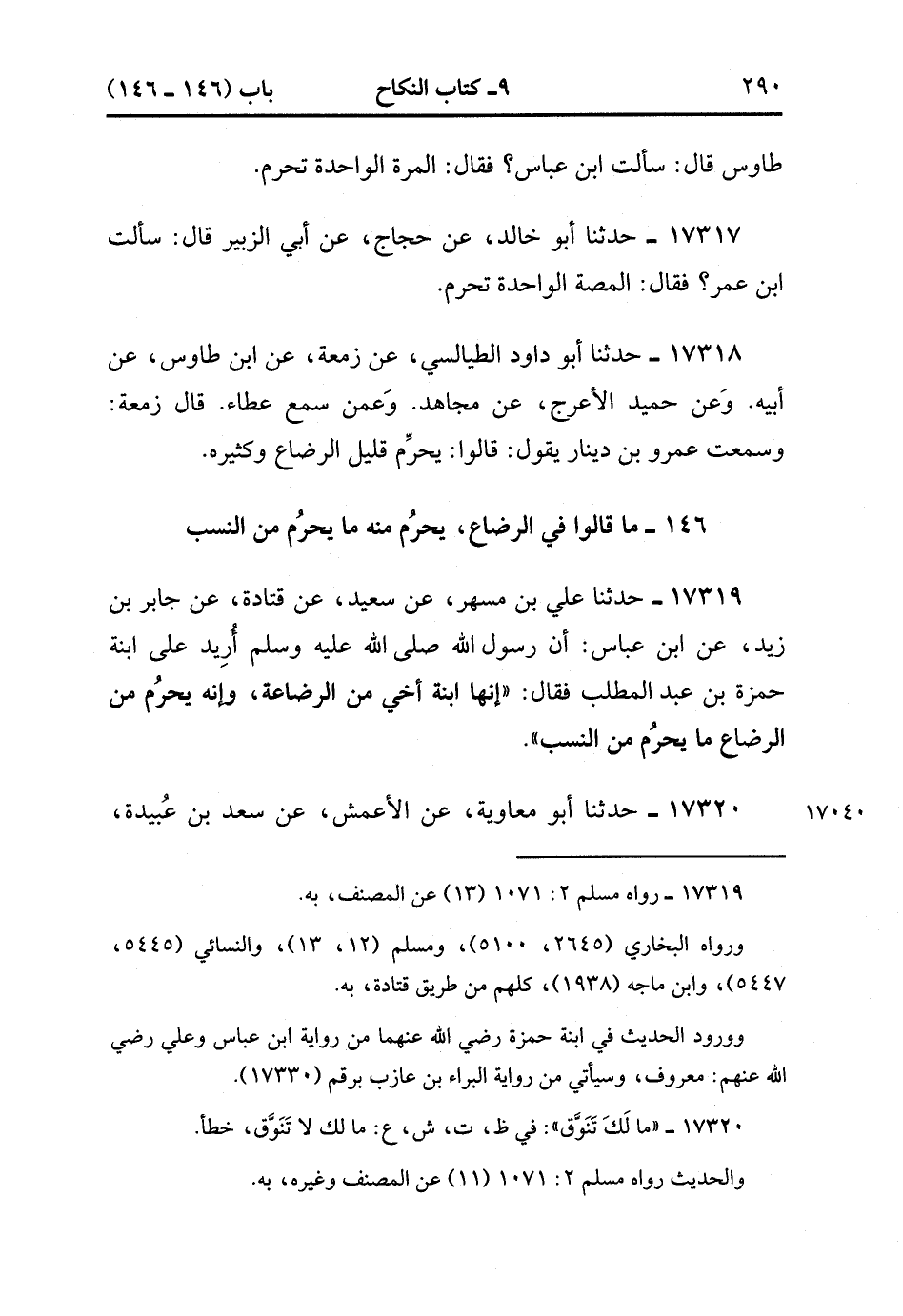 17319- حَدَّثَنَا عَلِيُّ بْنُ مُسْهِرٍ , عَنْ سَعِيدٍ , عَنْ قَتَادَةَ , عَنْ جَابِرِ بْنِ زَيْدٍ , عَنِ ابْنِ عَبَّاسٍ ، أَنَّ رَسُولَ اللهِ صَلَّى الله عَلَيْهِ وَسَلَّمَ أُرِيدَ عَلَى ابْنَةِ حَمْزَةَ بْنِ عَبْدِ الْمُطَّلِبِ , فَقَالَ : إنَّهَا ابْنَةُ أَخِي مِنَ الرَّضَاعَةِ وَإِنَّهُ يَحْرُمُ مِنَ الرَّضَاعَةِ مَا يَحْرُمُ مِنَ النَّسَبِ. (4/287:2).