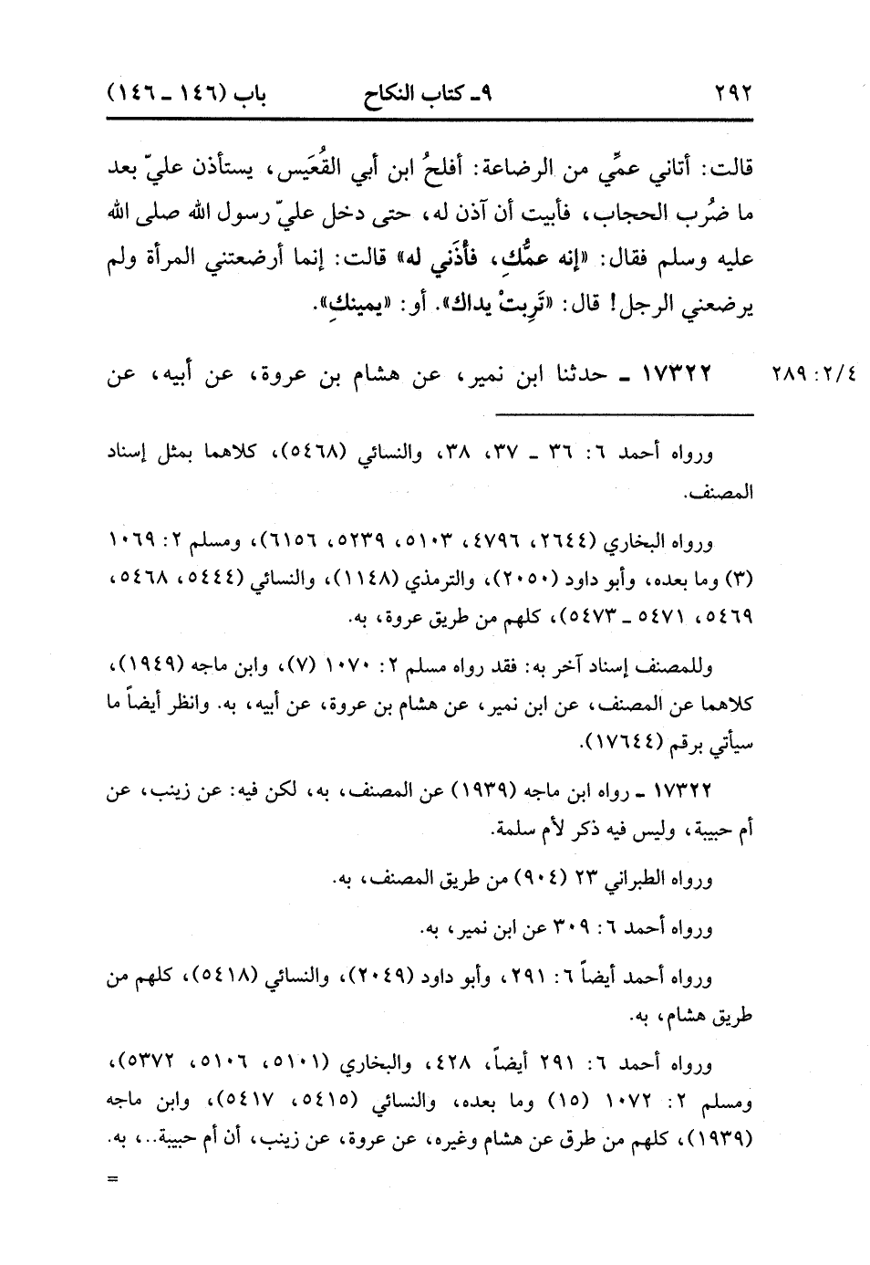 17322- حَدَّثَنَا ابْنُ نُمَيْرٍ , عَنْ هِشَامِ بْنِ عُرْوَةَ , عَنْ أَبِيهِ , عَنْ زَيْنَبَ بِنْتِ أُمِّ سَلَمَةَ , عَنْ أُمِّ سَلَمَةَ أن أُمَّ حَبِيبَةَ قَالَتْ : يَا رَسُولَ اللهِ ، هَلْ لَكَ فِي أُخْتِي ابْنَةِ أَبِي سُفْيَانَ ؟ قَالَ : إنَّهَا لاَ تَحِلُّ لِي قَالَتْ : فَإِنَّهُ قَدْ بَلَغَنِي أَنَّك تَخْطُبُ دُرَّةَ بِنْتَ أَبِي سَلَمَةَ قَالَ : بِنْتُ أَبِي سَلَمَةَ ؟ قَالَتْ : نَعَمْ ، قَالَ : وَاللَّهِ إِنْ لَمْ تَكُنْ رَبِيبَتِي فِي حِجْرِي مَا حَلَّتْ لِي ، إنَّهَا ابْنَةُ أَخِي مِنَ الرَّضَاعَةِ ، أَرْضَعَتْنِي وَأَبَاهَا ثُوَيْبَةُ فَلاَ تَعْرِضْنَ عَلَيَّ بَنَاتِكُنَّ وَلاَ أَخَوَاتِكُنَّ. (4/288:2).